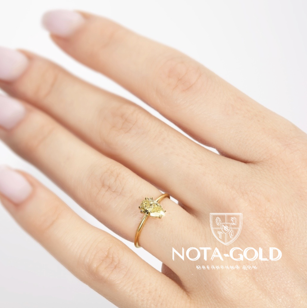 Выбор изделий с этим минералом довольно велик. Например, прекрасным подарком даме может стать роскошное женское кольцо с желтым лабораторным бриллиантом огранки «Груша». Такое украшение отлично подойдет в качестве сюрприза или предложения руки и сердца.