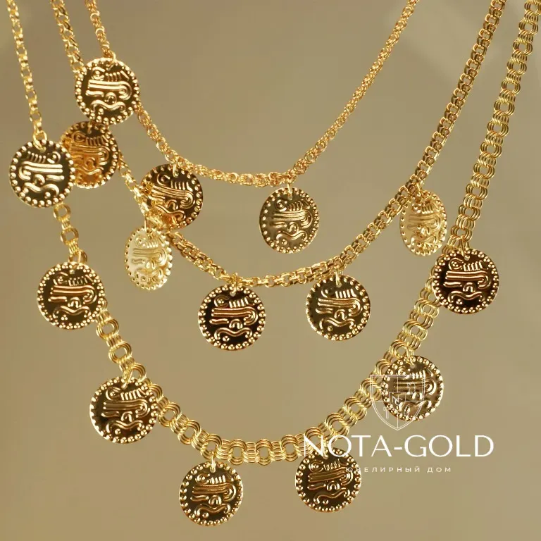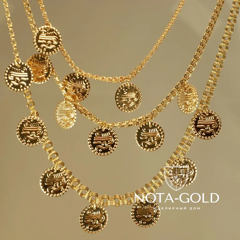 Классический вариант — толстая цепочка длиной 50–60 см. Nota-Gold предлагает массивную мужскую золотую цепь панцирного плетения с эмалью. Тонкая ювелирная работа подразумевает аккуратно выполненные узоры и прочные звенья. Украшение покажет высокий статус и отменный вкус владельца.