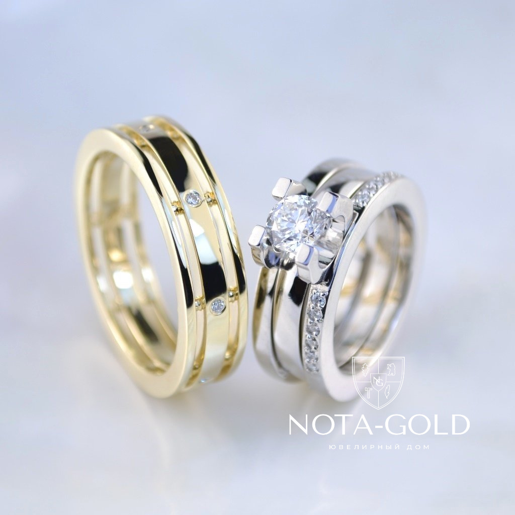 Обручальные кольца из белого и желтого золота с бриллиантами