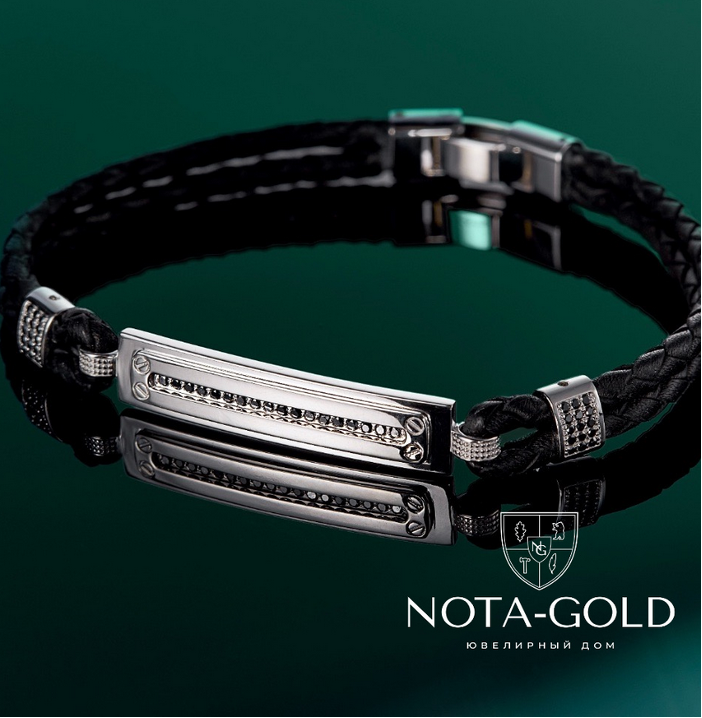 Кожаный плетеный браслет с золотой вставкой с бриллиантами