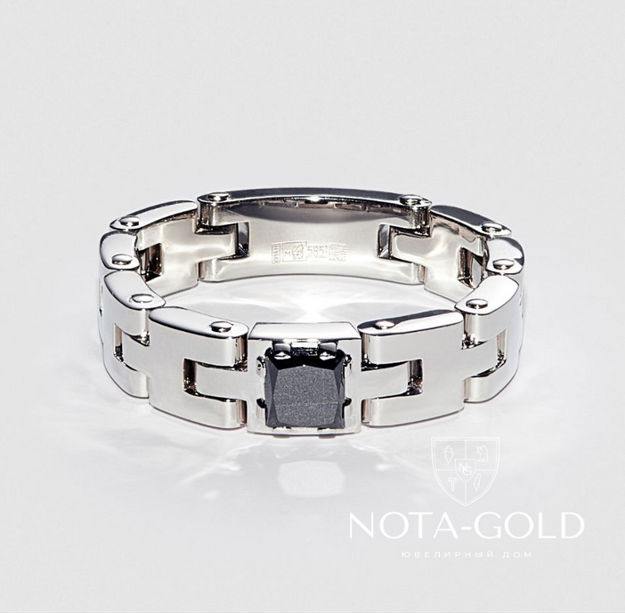 Мужская печатка-кольцо в виде браслета из белого золота с чёрными бриллиантами