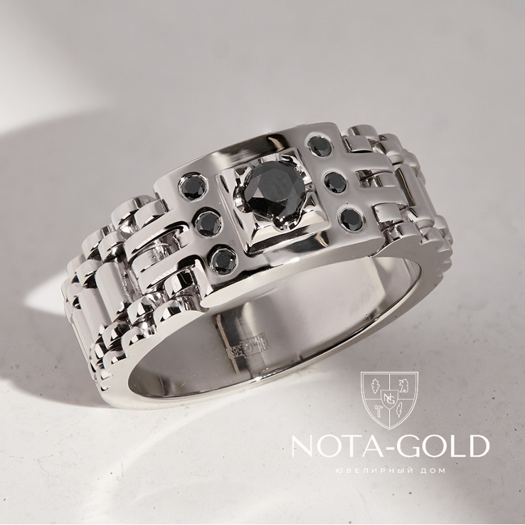 Золотое кольцо из браслетных звеньев с чёрным бриллиантом
