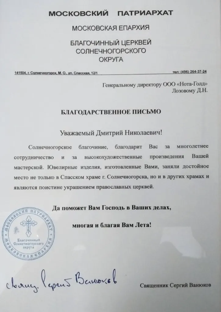 Солнечногорское благочиние, благодарит Вас за многолетнее сотрудничество и за высокохудожественные произведения Вашей мастерской. Ювелирные изделия, изготовленные Вами, заняли достойное место не только в Спасском храме г. Солнечногорска, но и в других храмах и являются поистине украшением православных церквей.