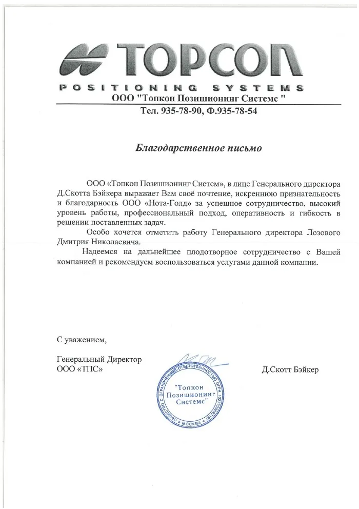 ООО «Топкон Позишионинг Систем», в лице Генерального директора Д.Скотта Бэйкера выражает Вам своё почтение, искреннюю признательность и благодарность ООО «Нота-Голд» за успешное сотрудничество, высокий уровень работы, профессиональный подход, оперативность и гибкость в решении поставленных задач.