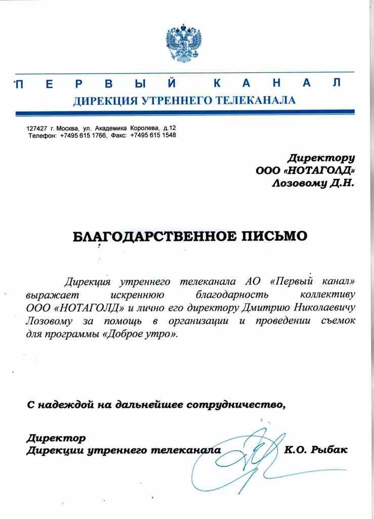 Дирекция утреннего телеканала АО "Первый канал" выражает искреннюю благодарность коллективу ООО "НОТАГОЛД" и лично его директору Дмитрию Николаевичу Лозовому за помощь в организации и проведении съёмок для программы "Доброе утро".