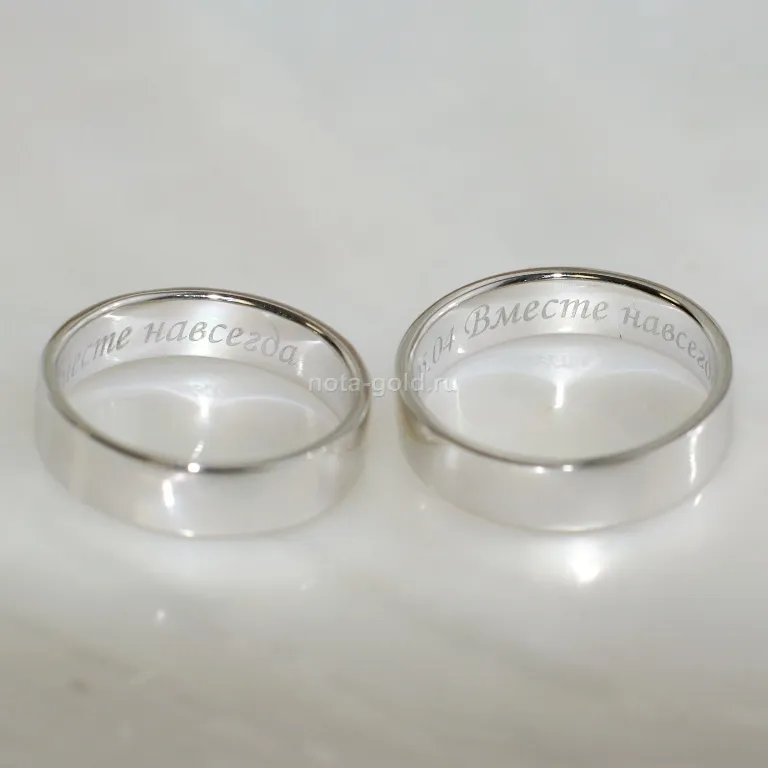 Ювелирная мастерская Nota-Gold изготовила на заказ золотые обручальные кольца. Ювелирные изделия выполнены из белого золота 585 пробы. Гладкая зеркальная поверхность колец подчеркивает торжественность Дня бракосочетания. Широкие парные обручальные кольца классической формы декорированы гравировкой, нанесенной на внутреннюю поверхность изделий в виде надписи «Вместе навсегда» и даты свадебной церемонии. Обручальные кольца с гравировкой – оригинальные украшения, которые призваны подчеркнуть уникальность и важность главного события в жизни молодой семьи. Мастерская Nota-Gold изготовит обручальные кольца отличного качества с гравировкой, нанесенной как на внутреннюю, так и на внешнюю поверхность изделий. В качестве надписи можно использовать дату, имена или небольшие фразы, а также всевозможные узоры и орнаменты.