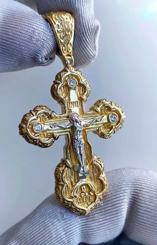Изготовление православного большого золотого крестика с бриллиантами и узорами авторского дизайна