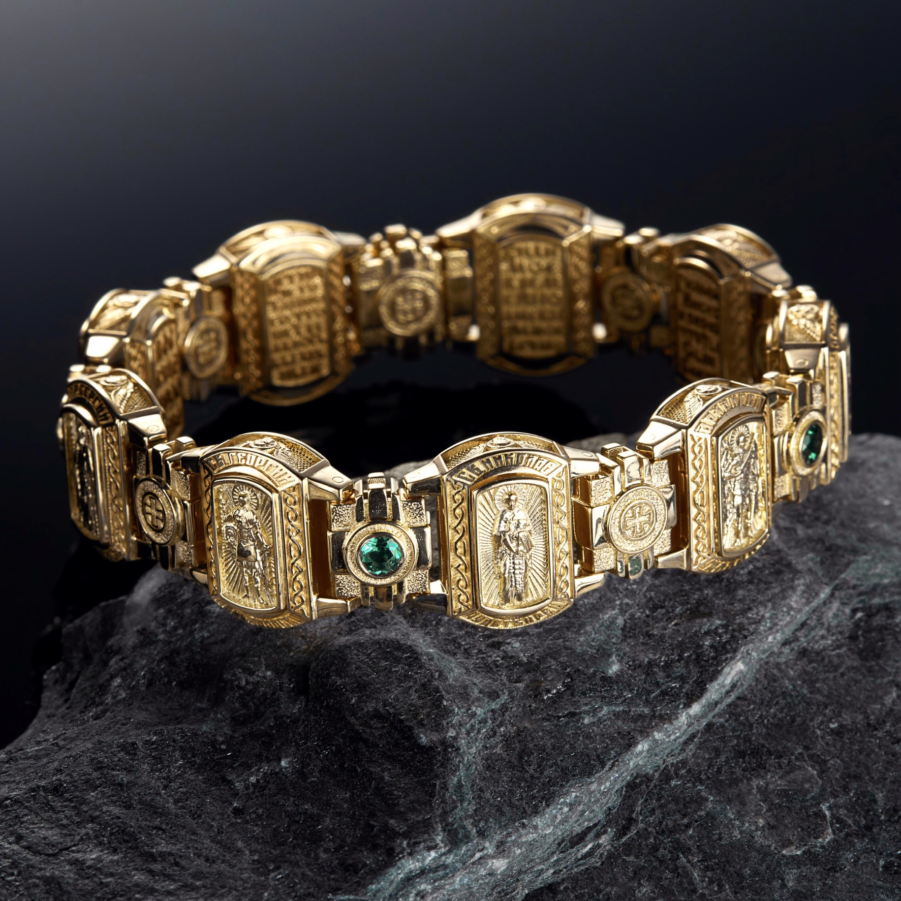 Изготовление мужского православного браслета с ликами святых из жёлтого золота и изумрудами