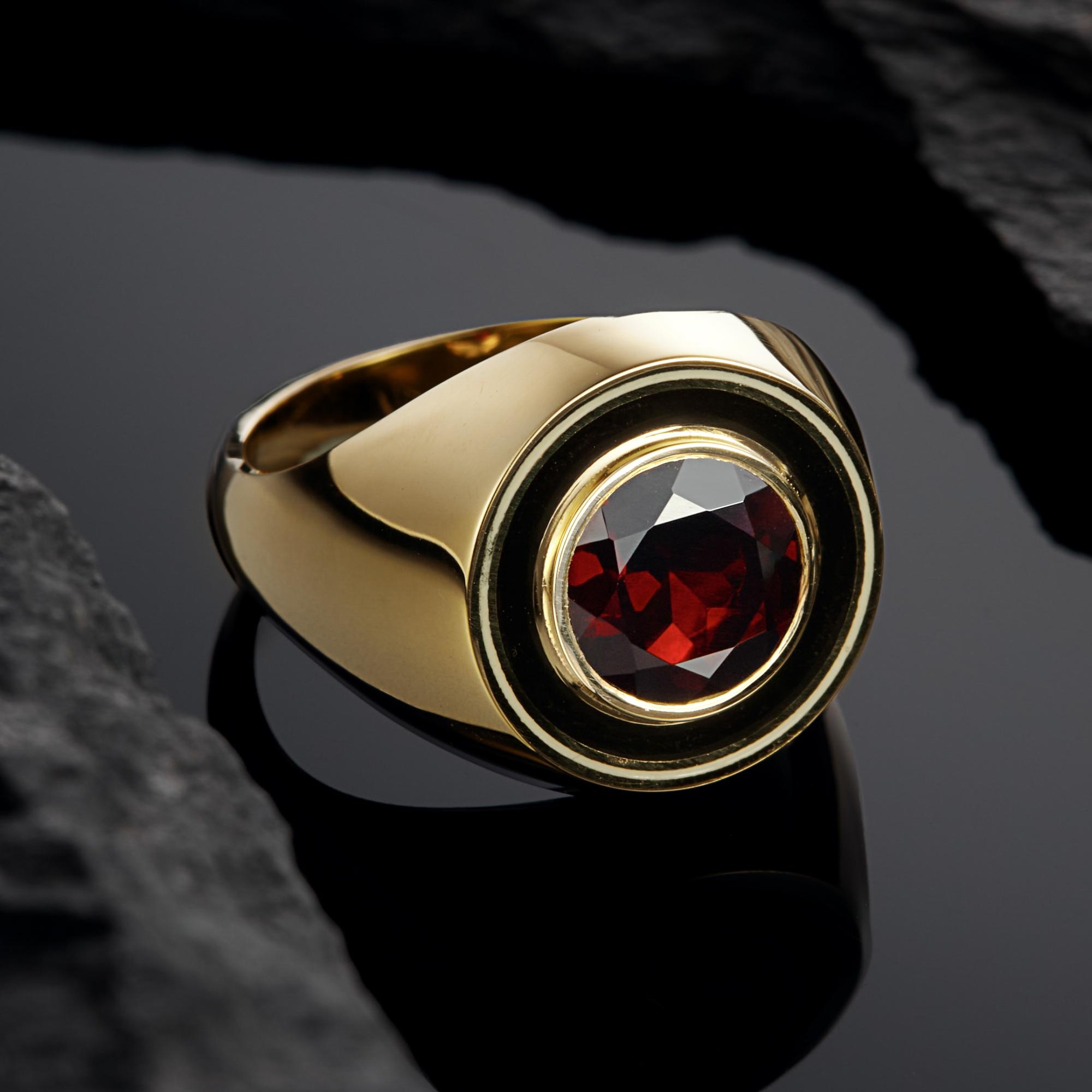 Мужское кольцо из желтого золота с круглым гранатом и черной эмалью