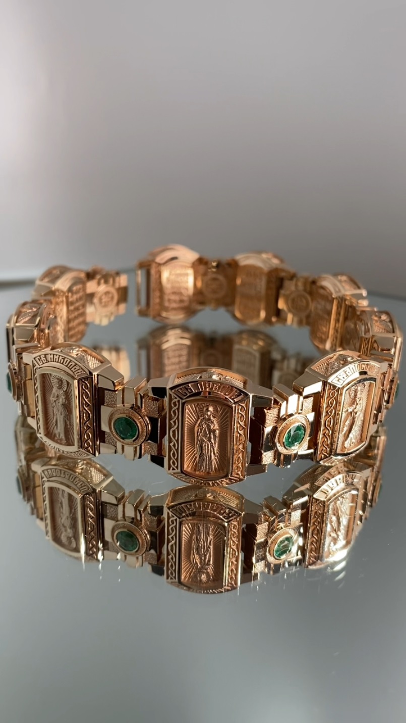 Изготовление мужского православного браслета с ликами святых из розового золота с изумрудами
