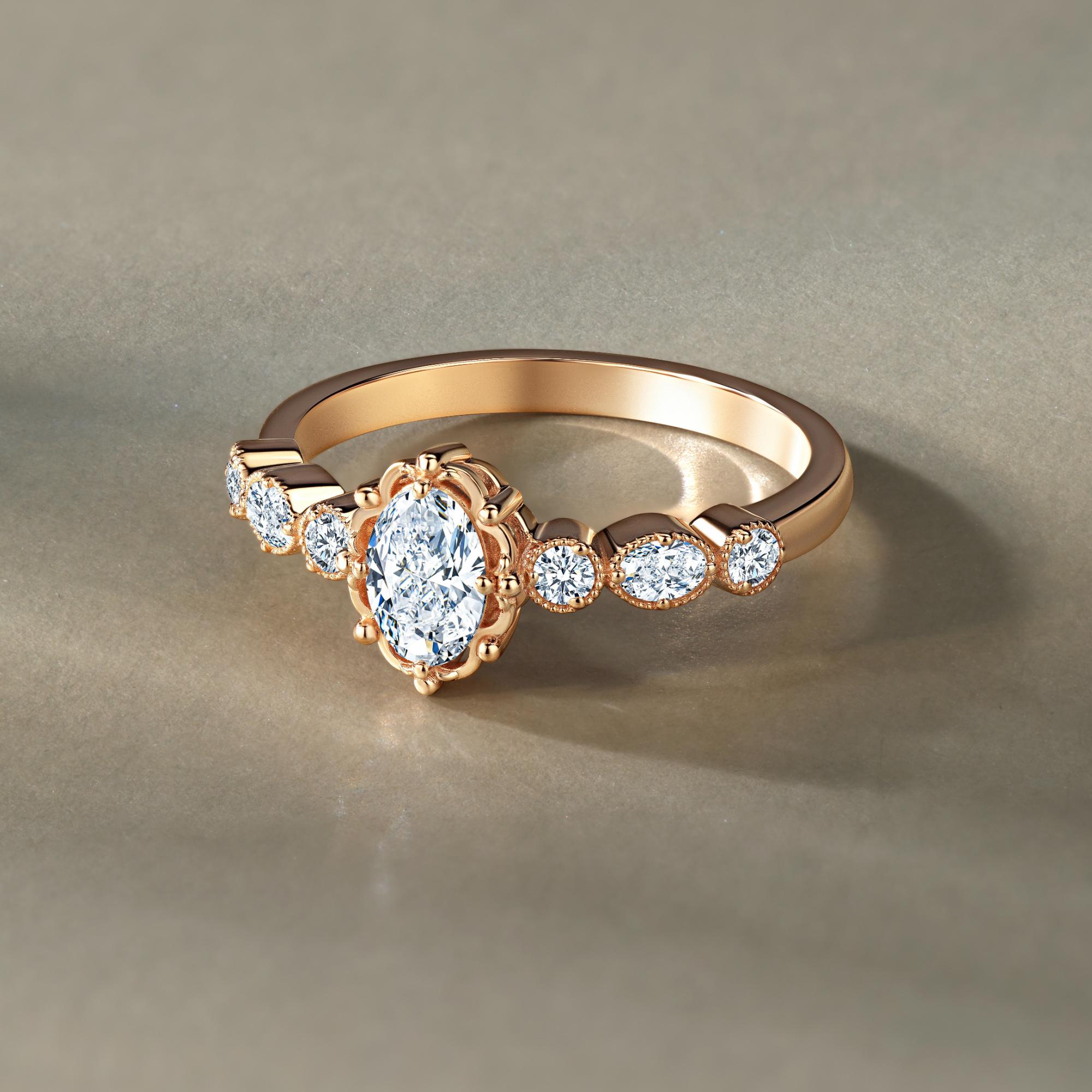 Винтажная элегантная эстетика золотого кольца с бриллиантами овальной и круглой огранки