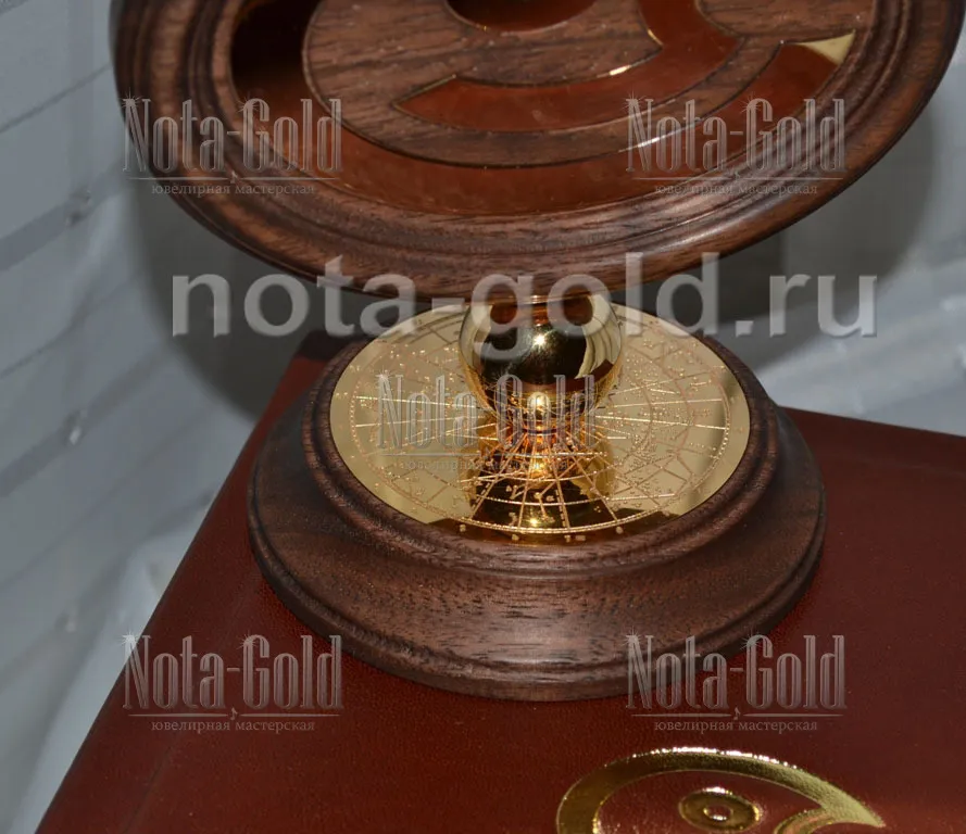 Ювелирная мастерская Nota-Gold изготовила корпоративный подарок из золота на заказ – кубок. Золотой кубок на деревянной подставке выполнен в виде логотипа компании. Изделие выполнено из желтого золота 585 пробы. Корпоративный подарок представлен в виде гравировки – восточного гороскопа с полированным шаром и полированного логотипа компании, инкрустированного в деревянную подставку из ореха. Кубок помещен в подарочный футляр из натуральной кожи с нанесением логотипа. Команда опытных ювелиров выполнит корпоратив на заказ из драгоценных металлов как по эскизам Заказчика, так и по собственным разработкам.