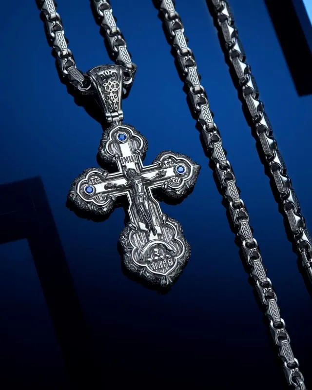 Клиент подобрал для себя Символ Веры и цепь из нашего обширного ассортимента. Определил размер цепи и дополнил Крест сапфирами