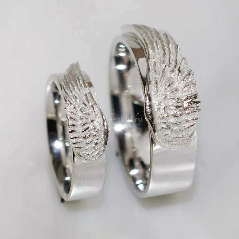 Ювелирная мастерская Nota-Gold изготовила на заказ парные обручальные кольца. Комплект украшений выполнен в белом золоте 585 пробы общим весом четырнадцать граммов. Глянцеая поверхность широких колец декорирована рельефным изображением крыльев. Символичность двух крыльев на кольцах подразумевает целостность и единство союза двух влюбленных - жениха и невесты. Обручальные кольца с символикой прекрасно дополнят свадебный образ будущих супругов и станут настоящими талисманами.