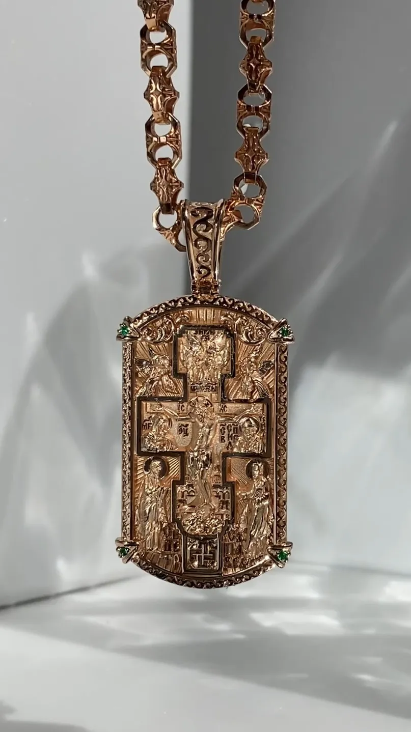 Изготовление православного нательного жетона иконки с ликами святых и молитвой из красного золота с изумрудами