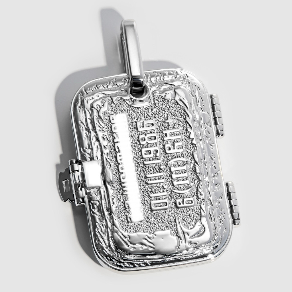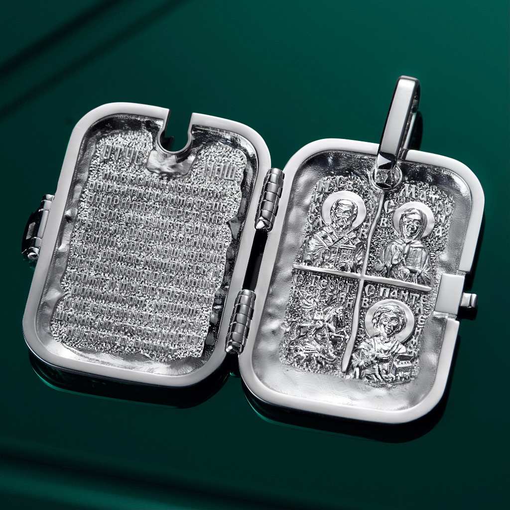 Внутри ладанки выгравирован текст молитвы Отче Наш и лики Святых