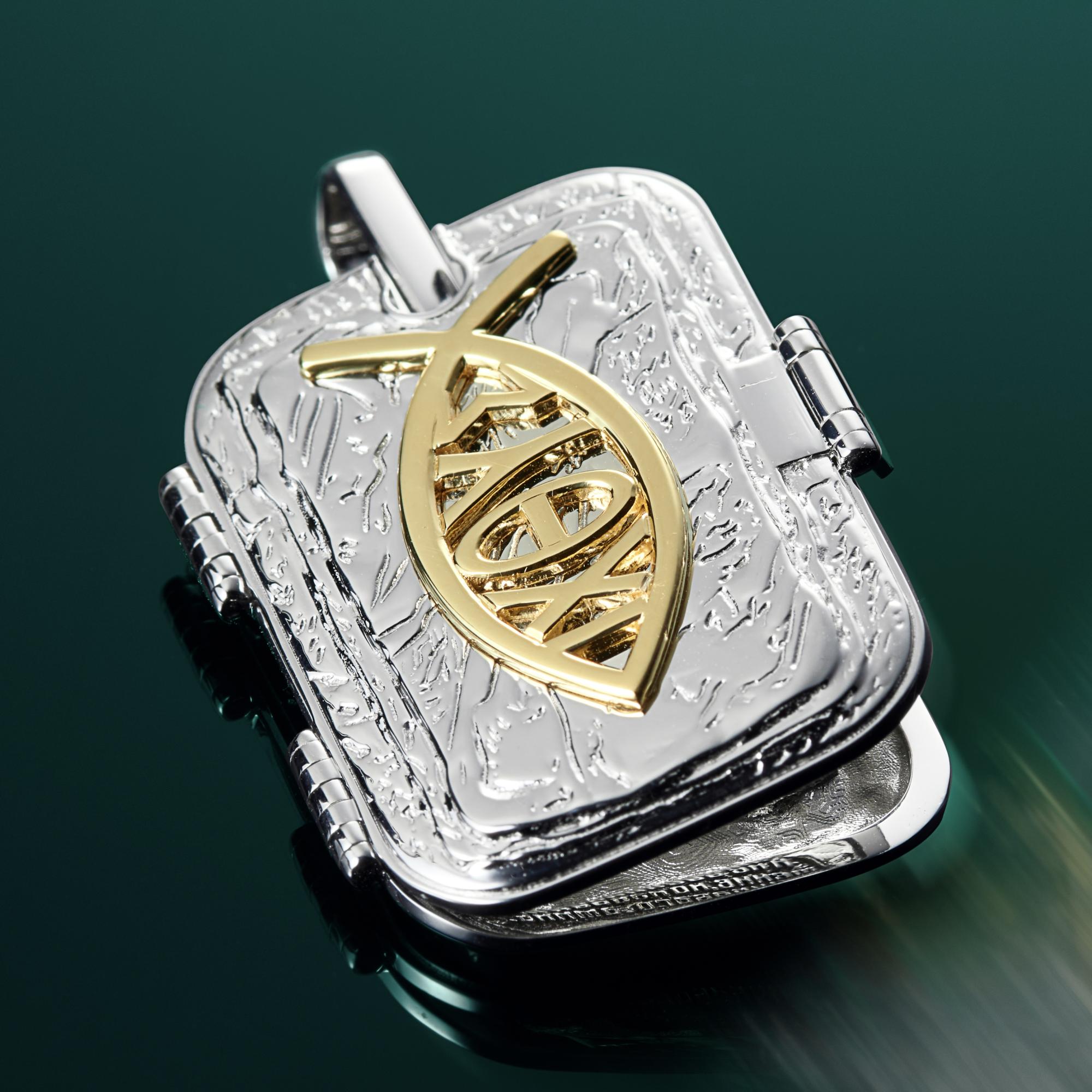 На внешней стороне размещен Ихтис - древний акроним Иисуса Христа из желтого золота