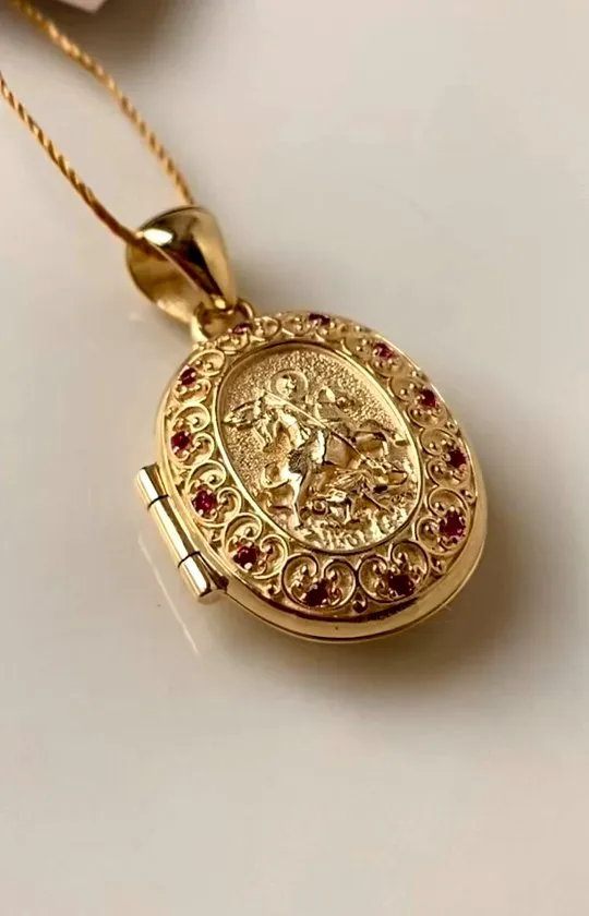 Изготовление открывающегося медальона с Георгием Победоносцем под фотографию из красного золота с рубинами