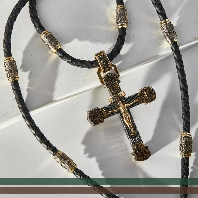 Нательный православный крест из желтого золота и дерева эбен на кожаном шнурке гайтане с золотыми вставками