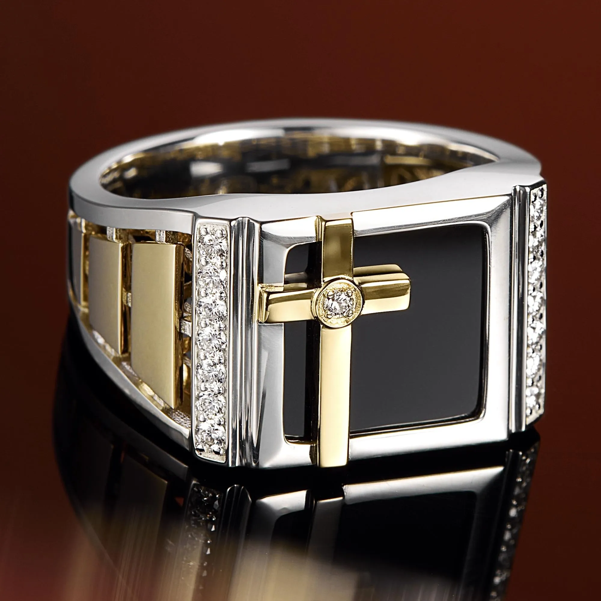 Мужской перстень печатка Крест из двух видов золота с бриллиантами и ониксом