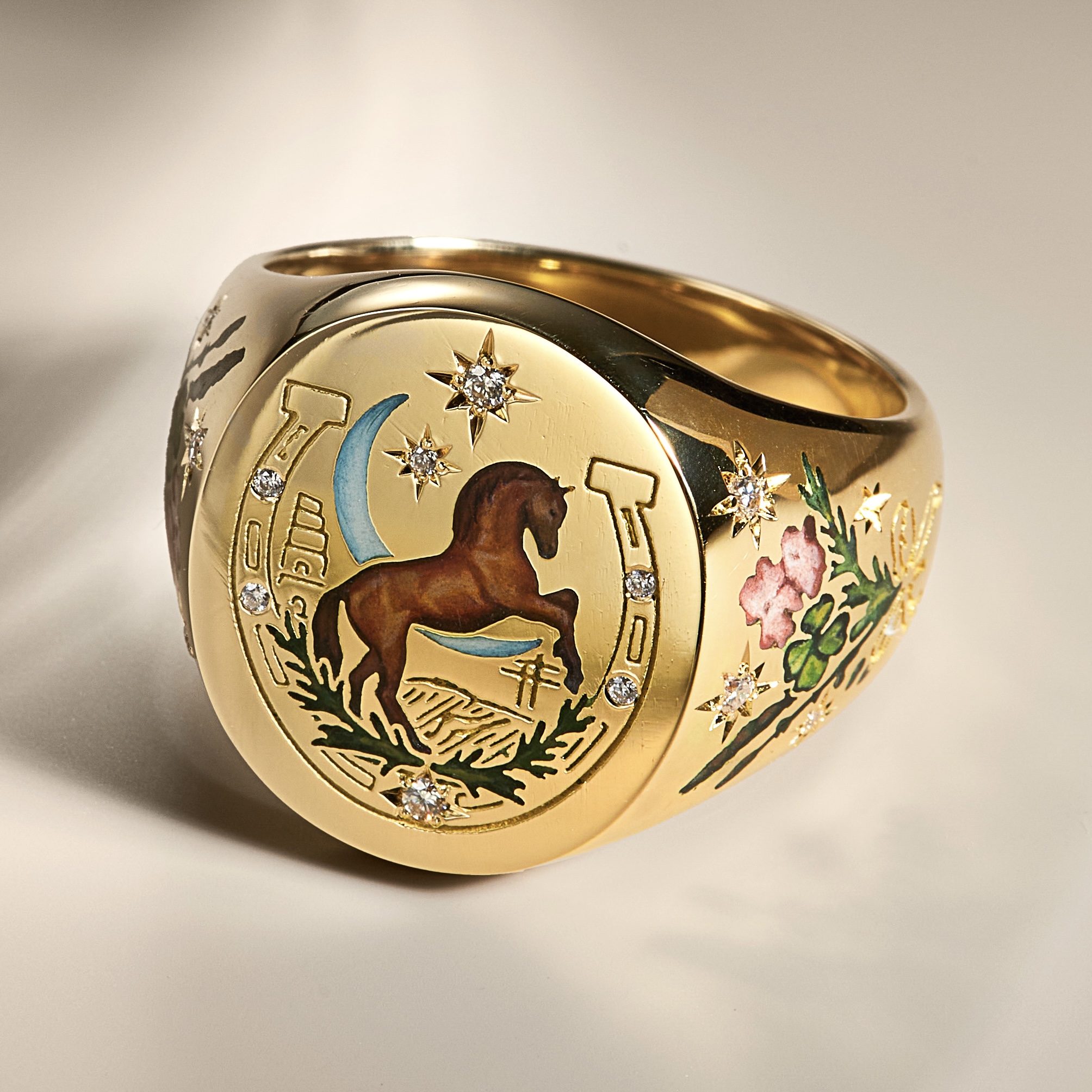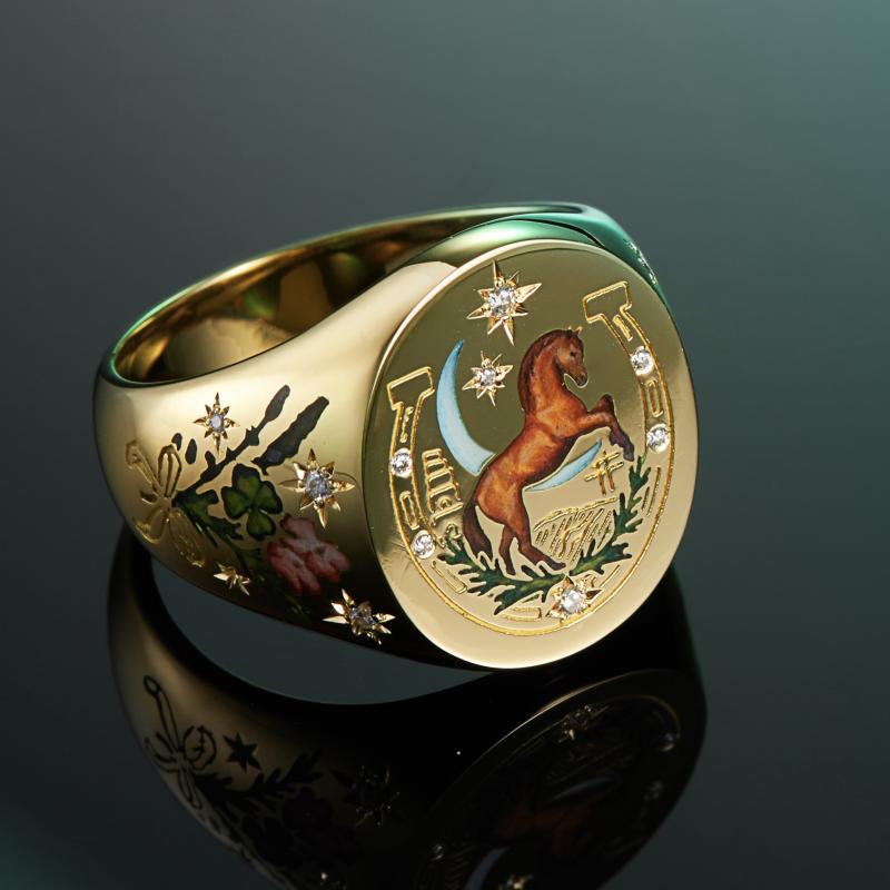 Изготовление женской печатки с бриллиантами из золота с эмалью
