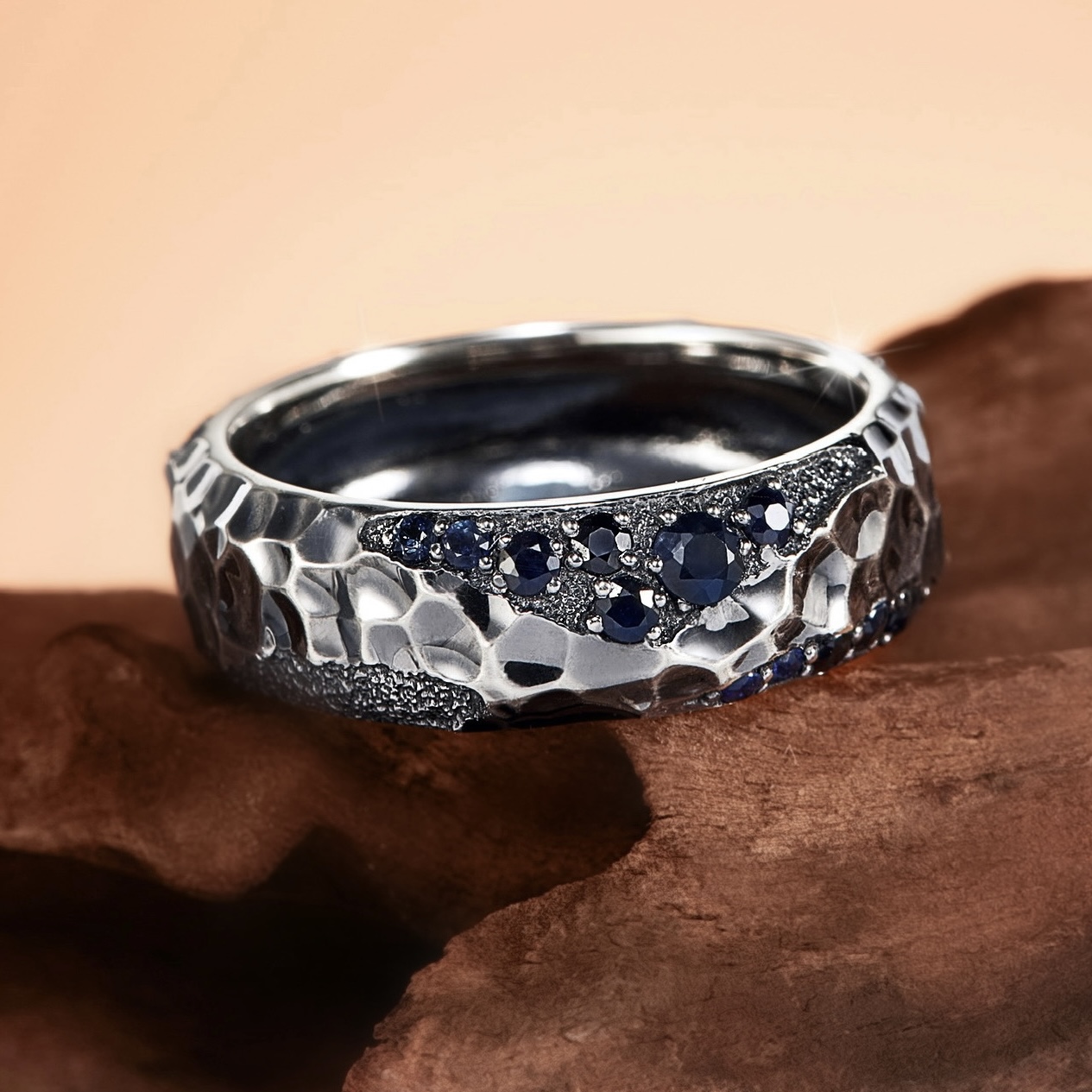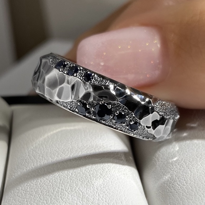 Изготовление мужского кольца с сапфирами и бриллиантами из белого золота с фактурной поверхностью и чернением