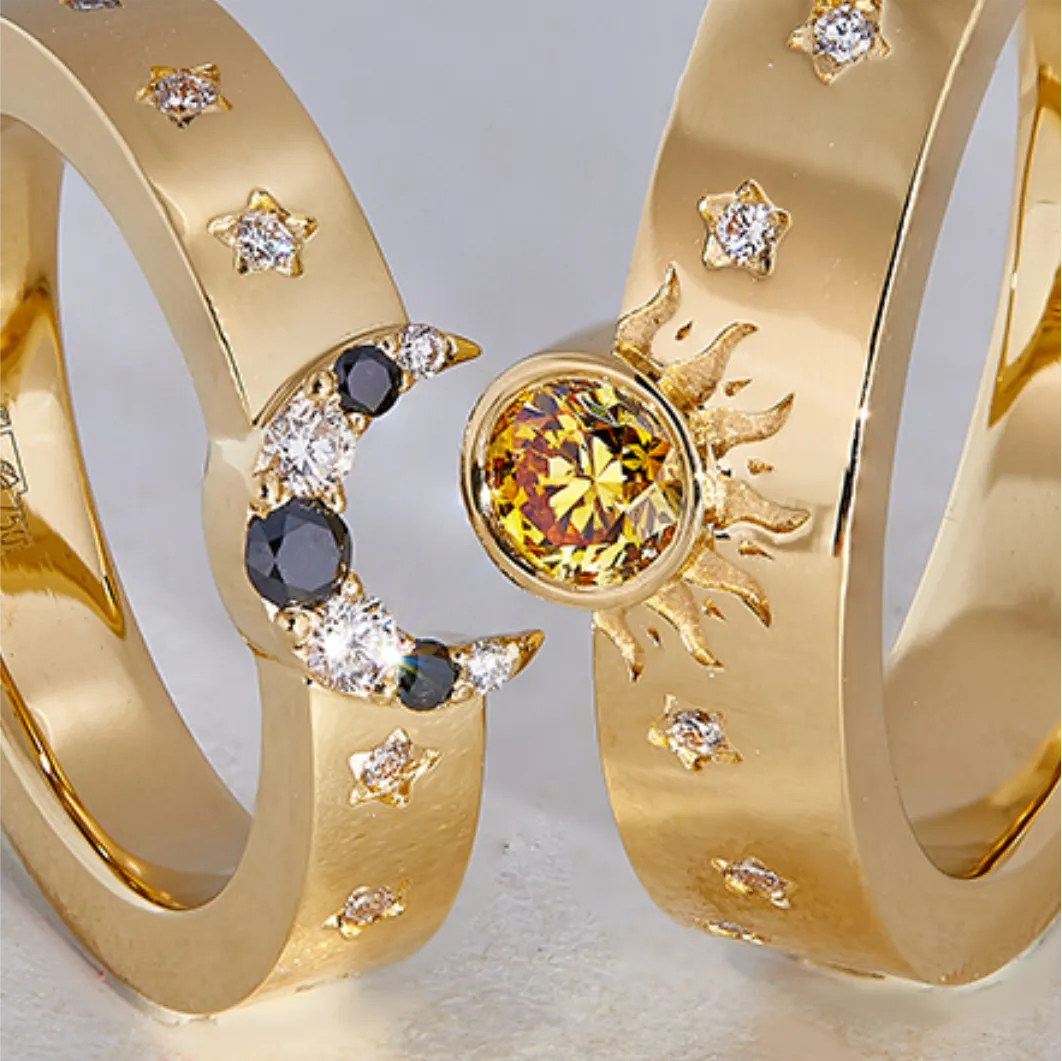 Изготовление золотых обручальных колец Солнце и Луна с драгоценными камнями