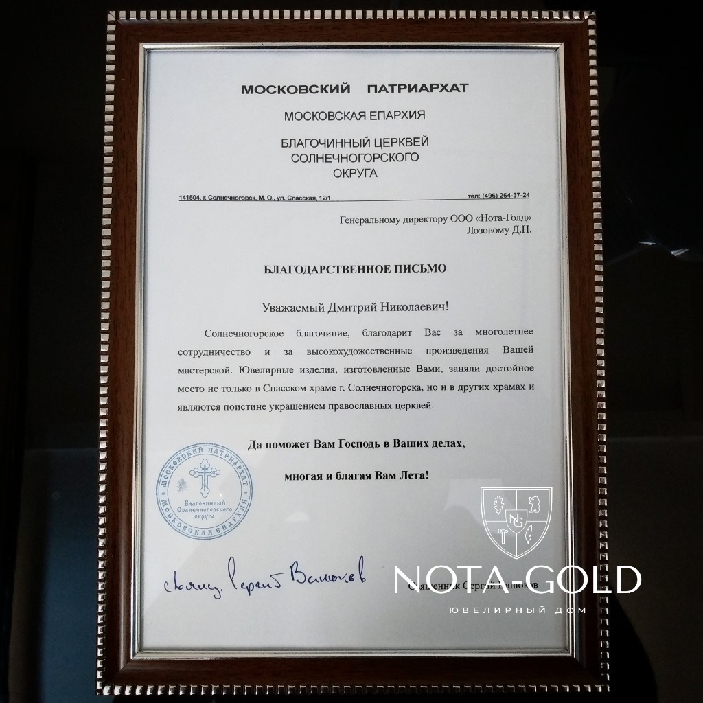 Уважаемы Дмитрий Николаевич! Солнесногорское благочиние, благодарит Вас за многолетнее сотрудничество и за высокохудожественные произведения Вашей мастерской. Ювелирнве изделия, изготовленнын Вами, заняли достойное место не только в Спасском храме г. Солнечногорска, но и в других храмах и являются поистине украшением православных церквей. Да поможет Вам Господь в Ваших делах, многая и благая Вам Лета!