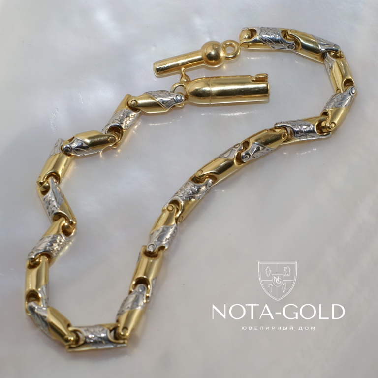 Цепочка плетения Дубок изготавливается на заказ по Вашим индивидуальным параметрам (вес, длина, ширина). Заказать можно из красного, жёлтого или белого золота 585, либо 750 пробы, может быть изготовлена из материала Мастерской или из золота Заказчика. Цепочку из белого золота можно дополнительно покрыть родием для придания холодного, стального оттенка. Так же, дополнительно, можно почернить золотую цепь Дубок двухцветный, что особо подчеркнёт рельеф плетения. Исходя из Ваших предпочтений, мы изготавливаем любой замок из золота: карабин, шпрингель, пенал, коробочка. Все подробности по стоимости и возможности изготовления, Вы можете уточнить у наших менеджеров.