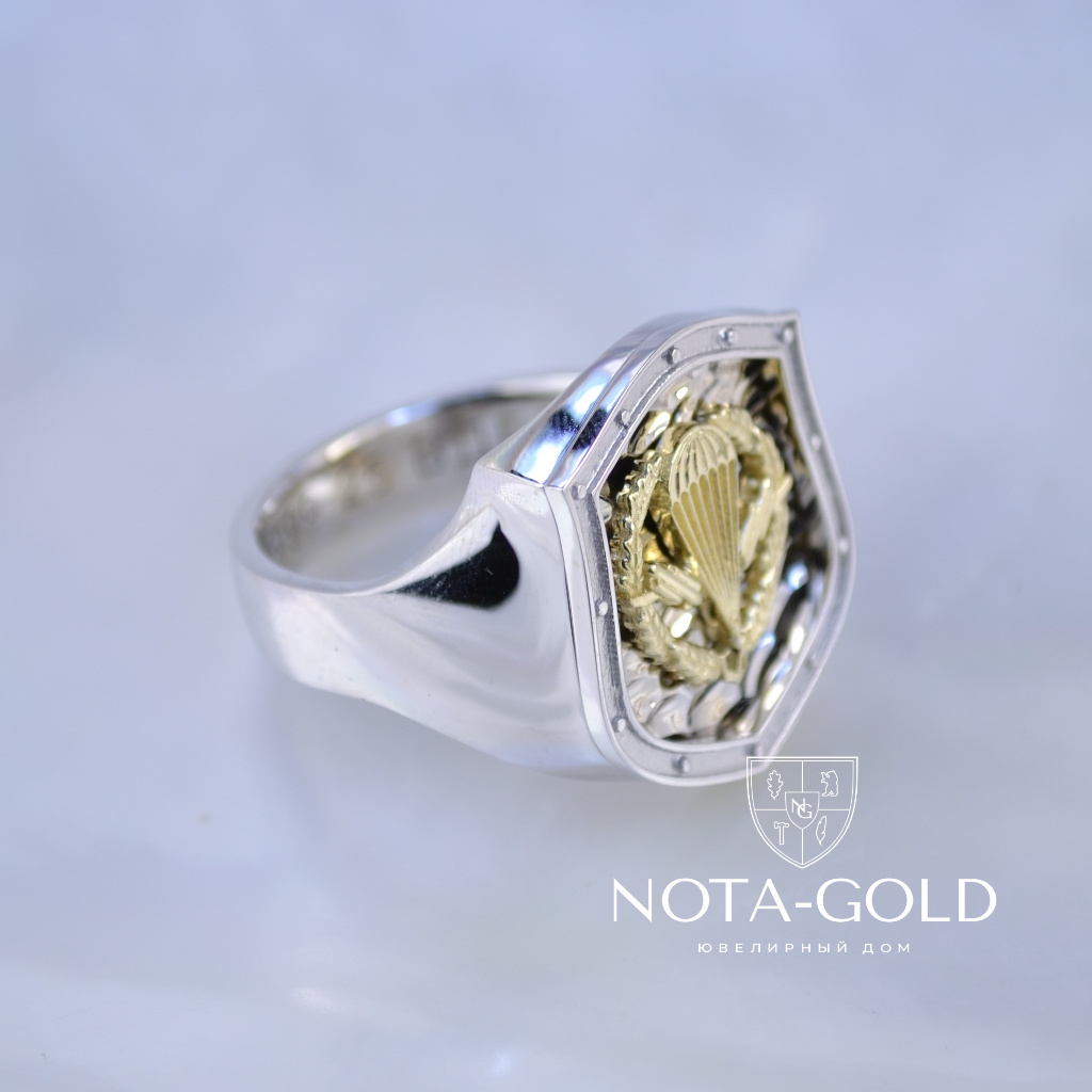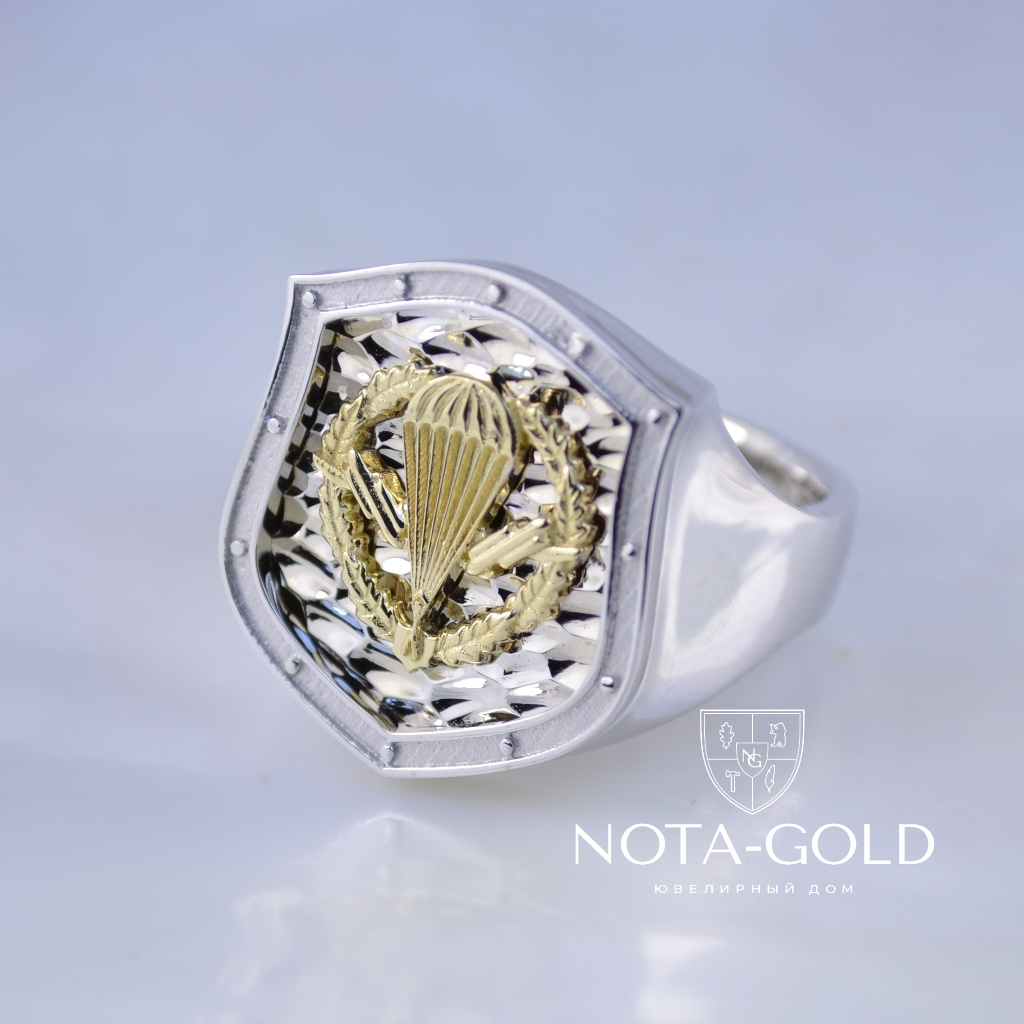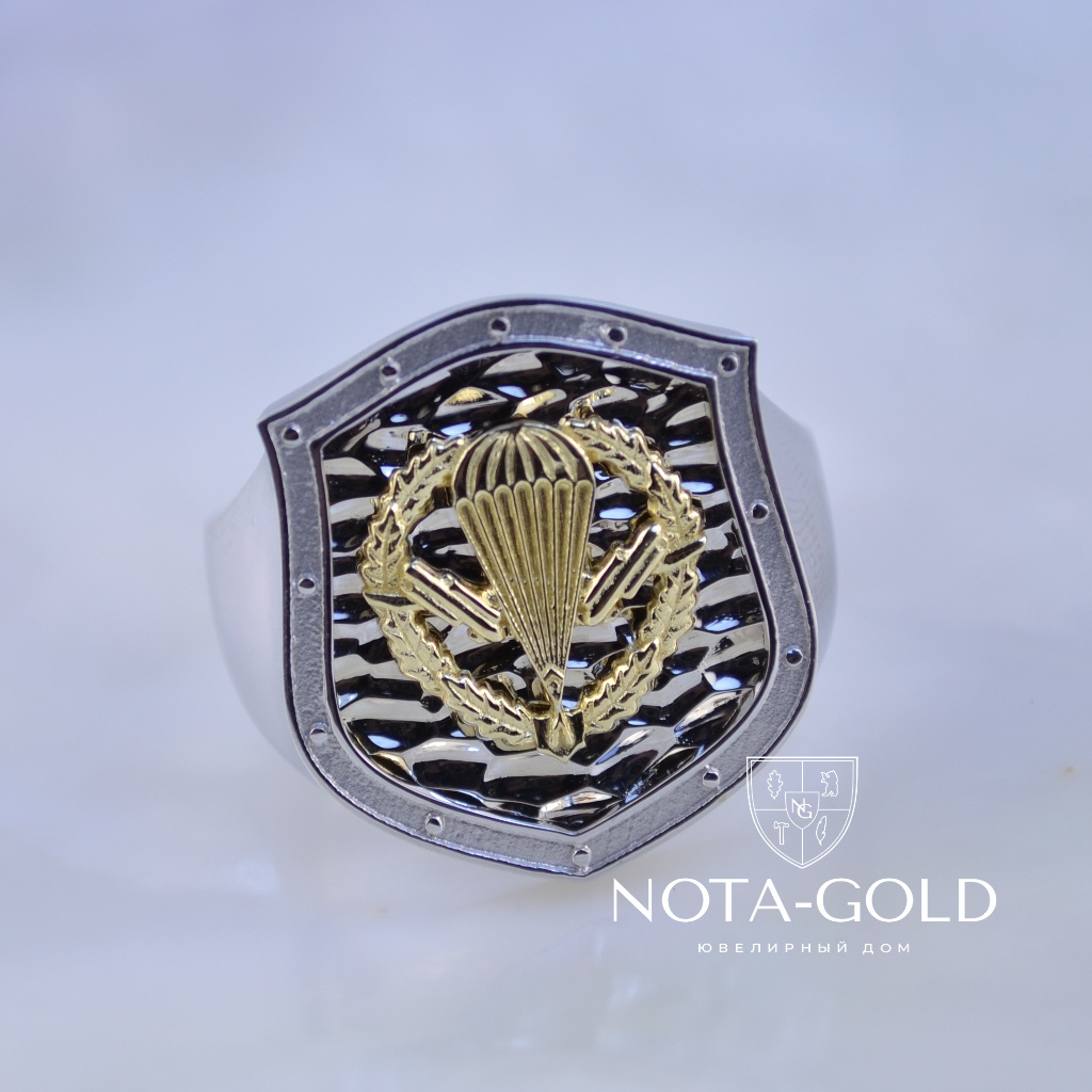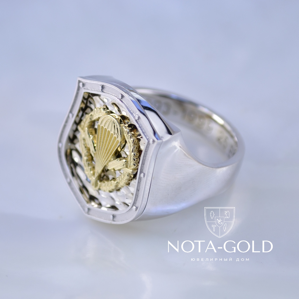 Кольцо-печатка двухцветная изготовлена из белого и желтого золота 585 пробы. Центральный элемент кольца - щит с рельефной поверхностью из белого золота с декором символикой ВДВ из желтого золота. Мы изготовим печатки с символикой ВДВ как из золота, так и из серебра.