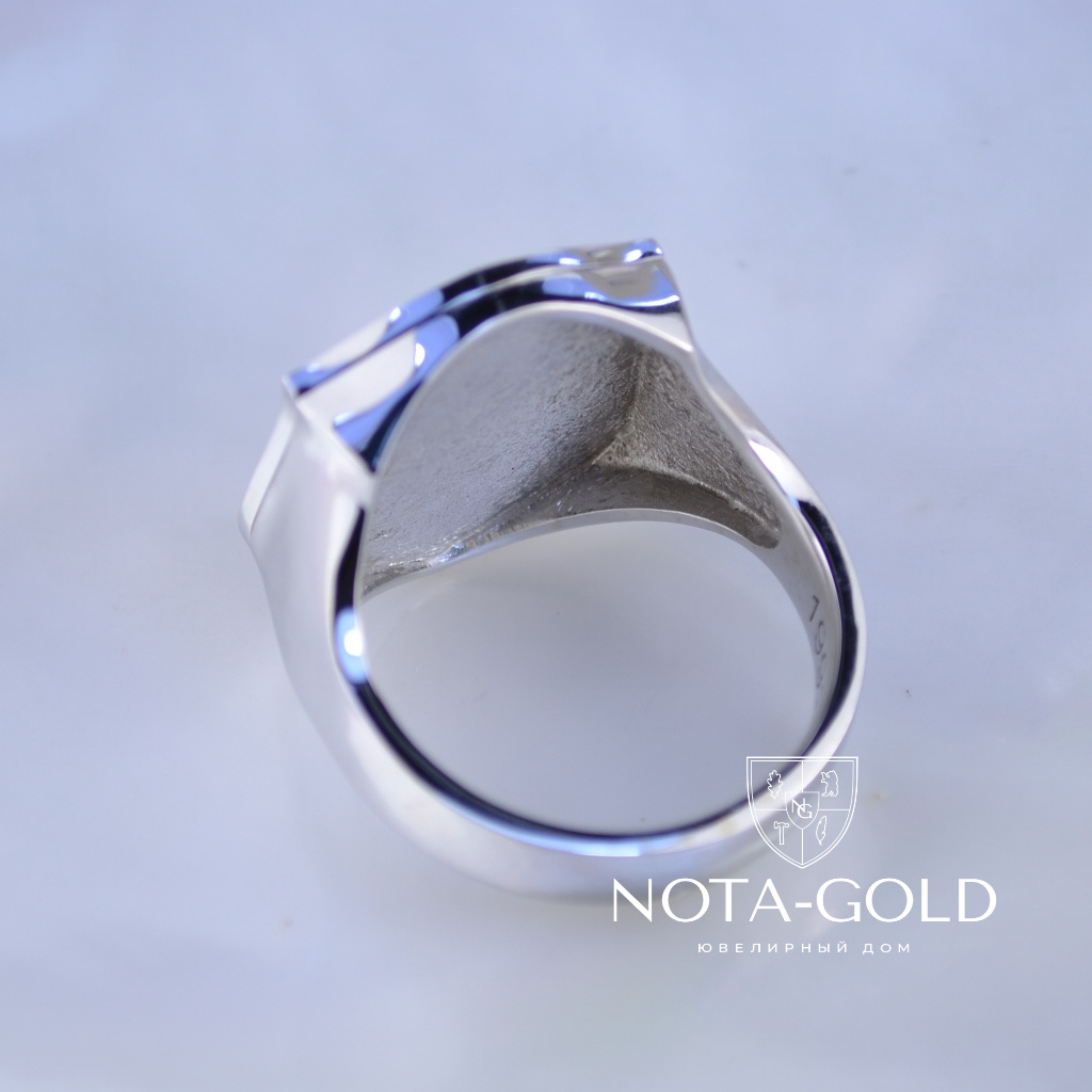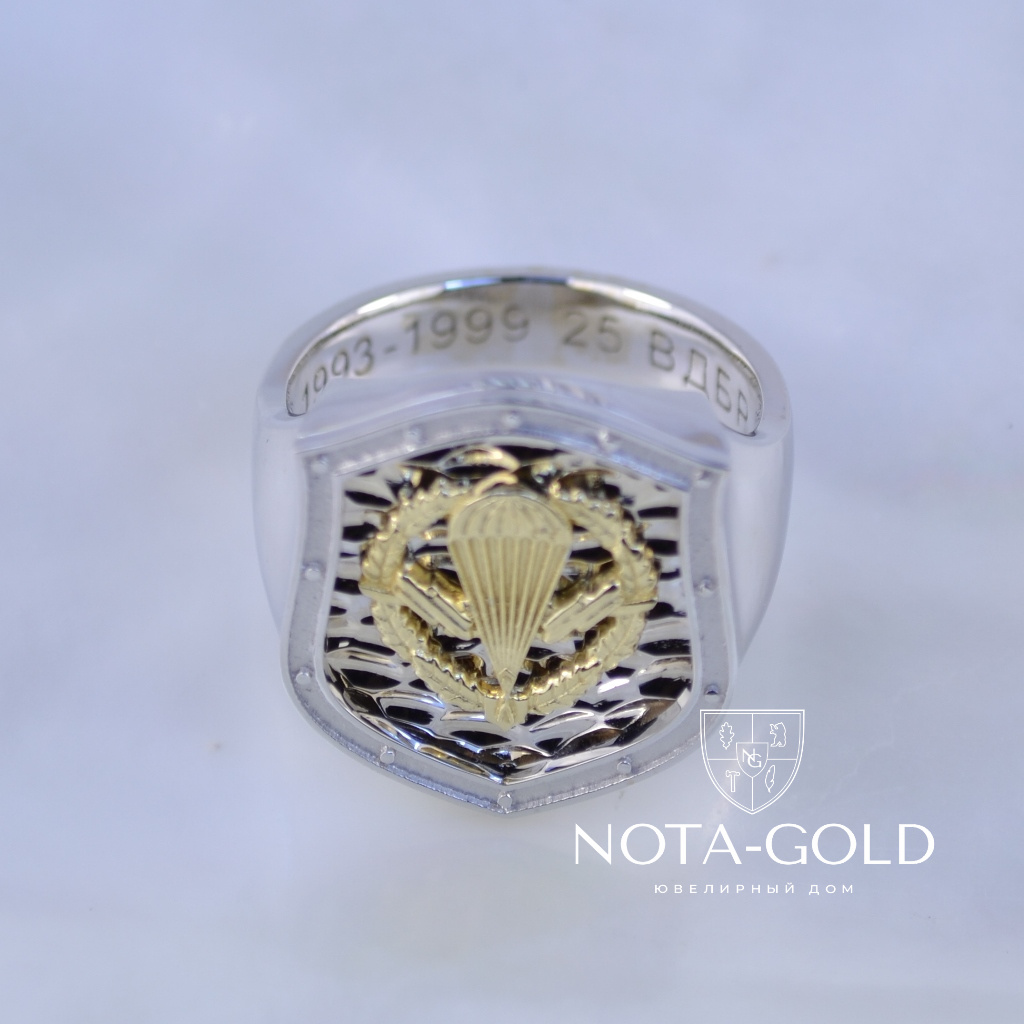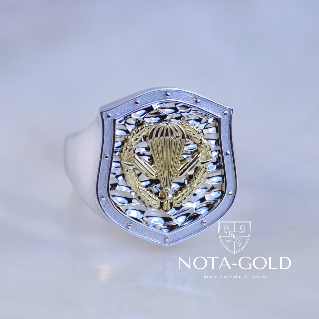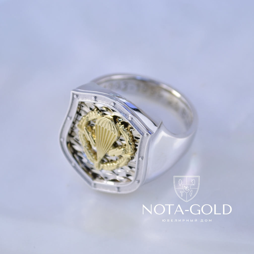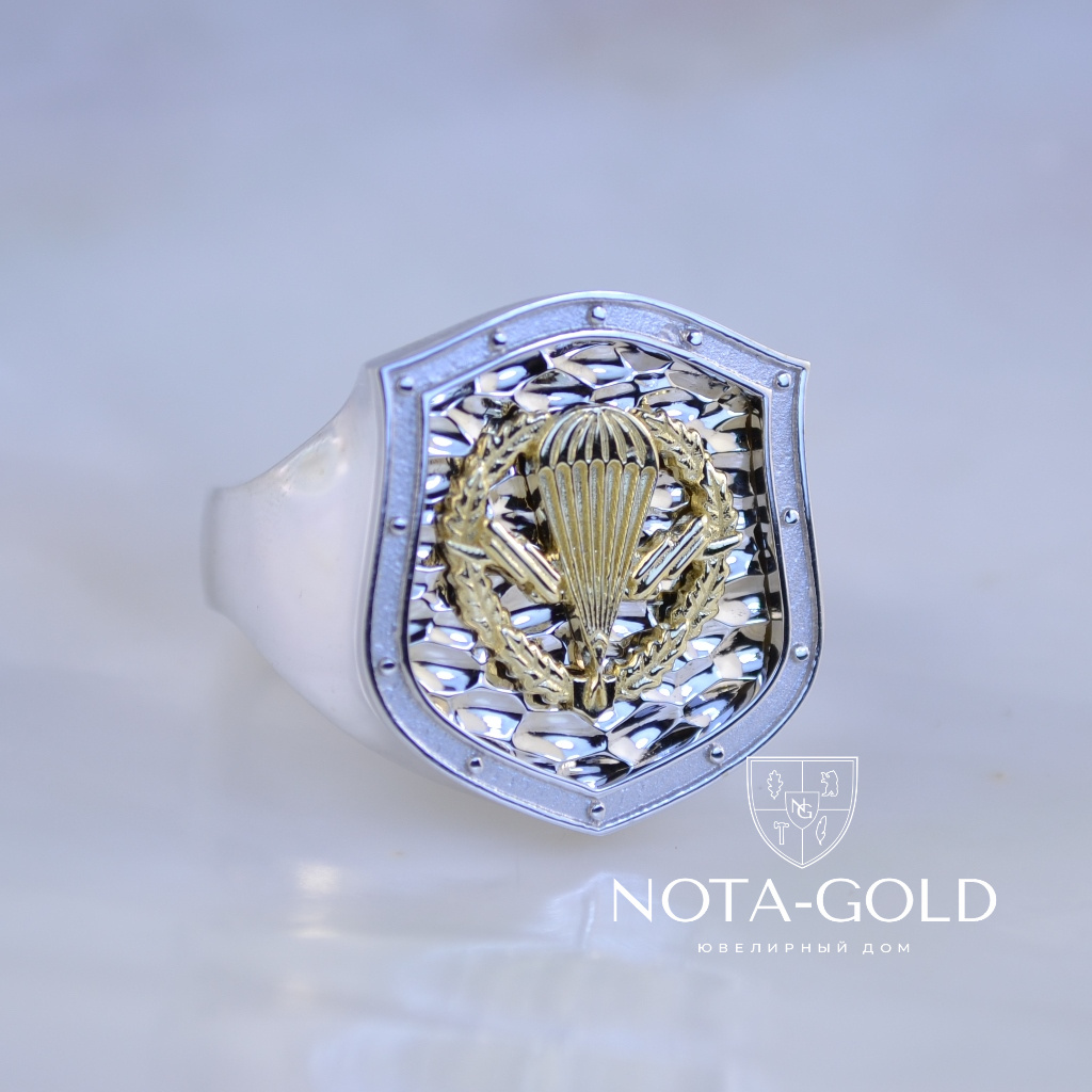 Кольцо-печатка двухцветная изготовлена из белого и желтого золота 585 пробы. Центральный элемент кольца - щит с рельефной поверхностью из белого золота с декором символикой ВДВ из желтого золота. Мы изготовим печатки с символикой ВДВ как из золота, так и из серебра.