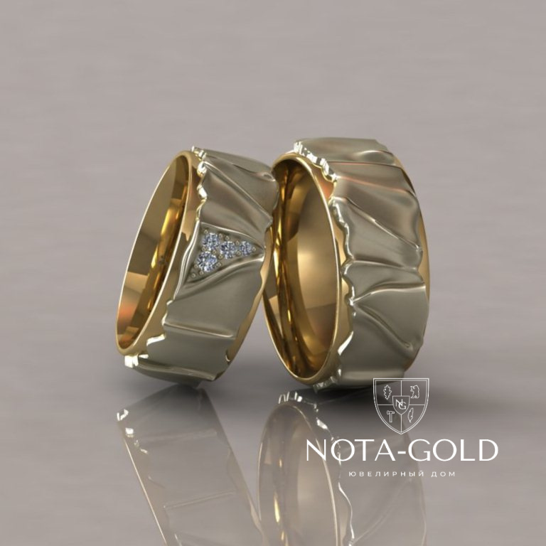 Фактурные двухцветные обручальные кольца с бриллиантами с оплавленной пластиной на заказ (Вес пары: 22 гр.)