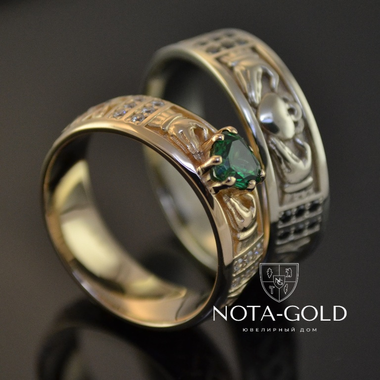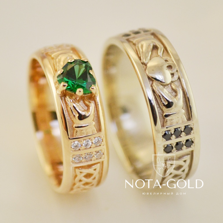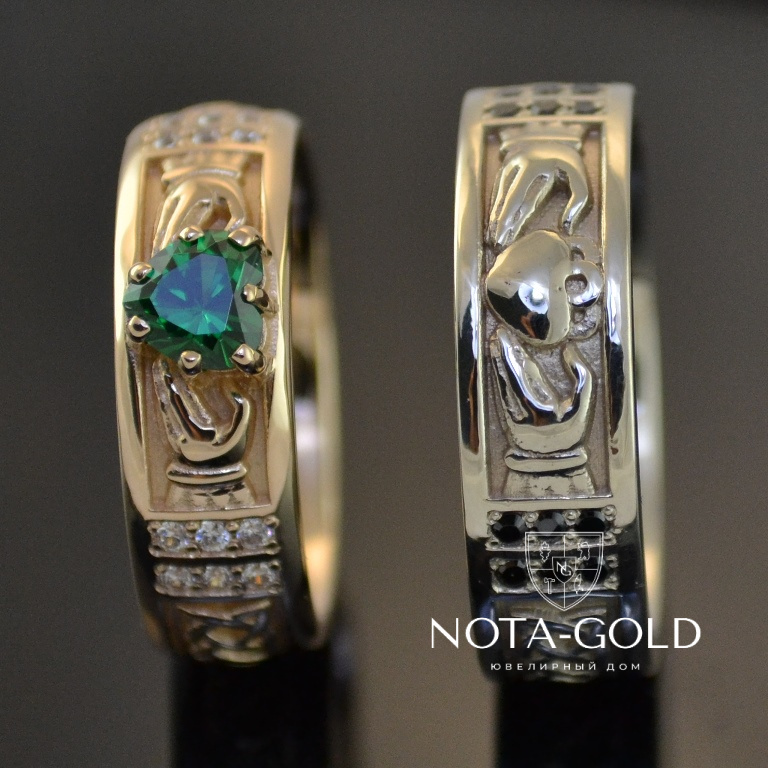 Кладдахские обручальные кольца с изумрудом и бриллиантами на заказ (Вес пары: 10 гр.)
