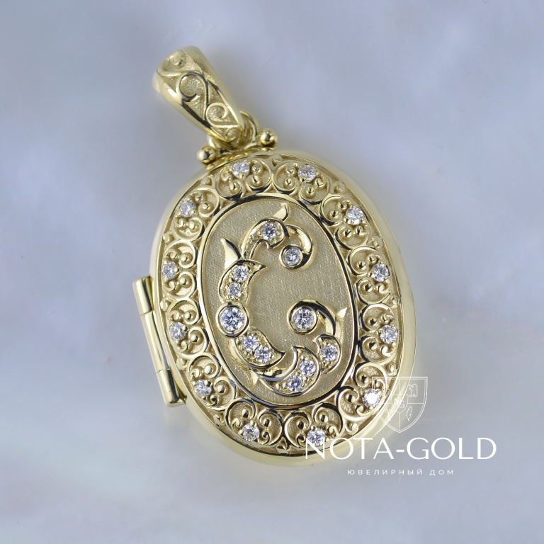 Медальон с инициалами и бриллиантами из золота открывающийся под фотографии (Вес: 9 гр.) Высота золотого медальона с ушком 31 мм, без ушка 22 мм. Камни 1.1- 12шт в ажуре по кругу; в букве-1.6-1шт, 1.2-1шт, 1.0- 9шт. Буква или инициалы могут быть изменены любые - по желанию клиента.