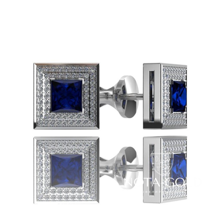 Пусеты из белого золота с бриллиантами и сапфирами квадратной формы (Вес: 8 гр.)