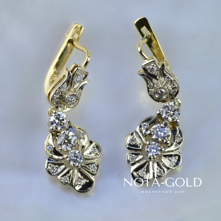 Серьги в виде цветочков из жёлтого золота с бриллиантами (Вес: 8 гр.)