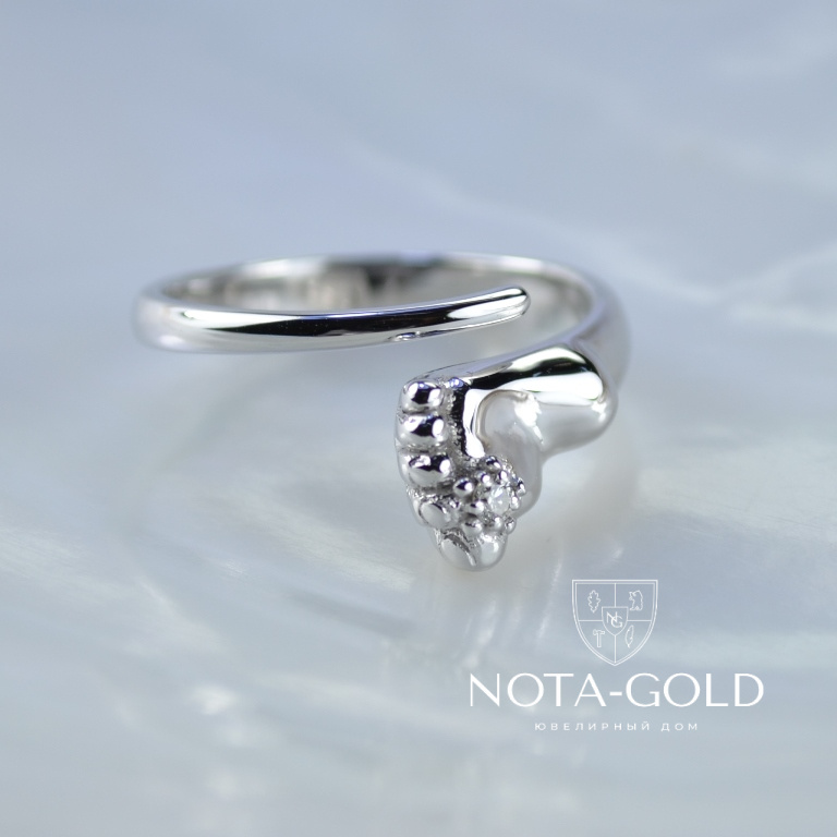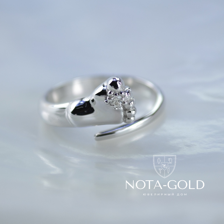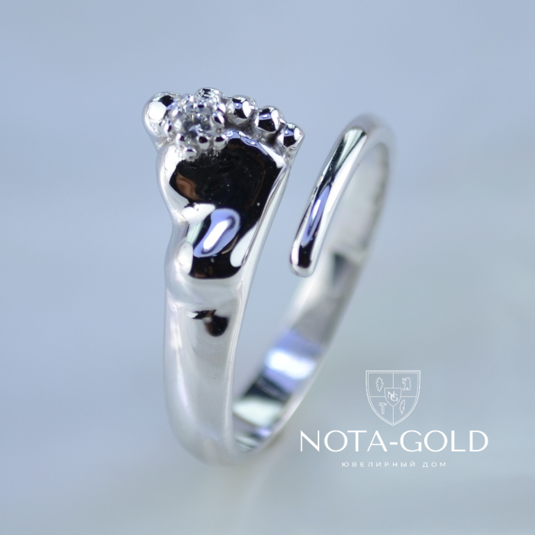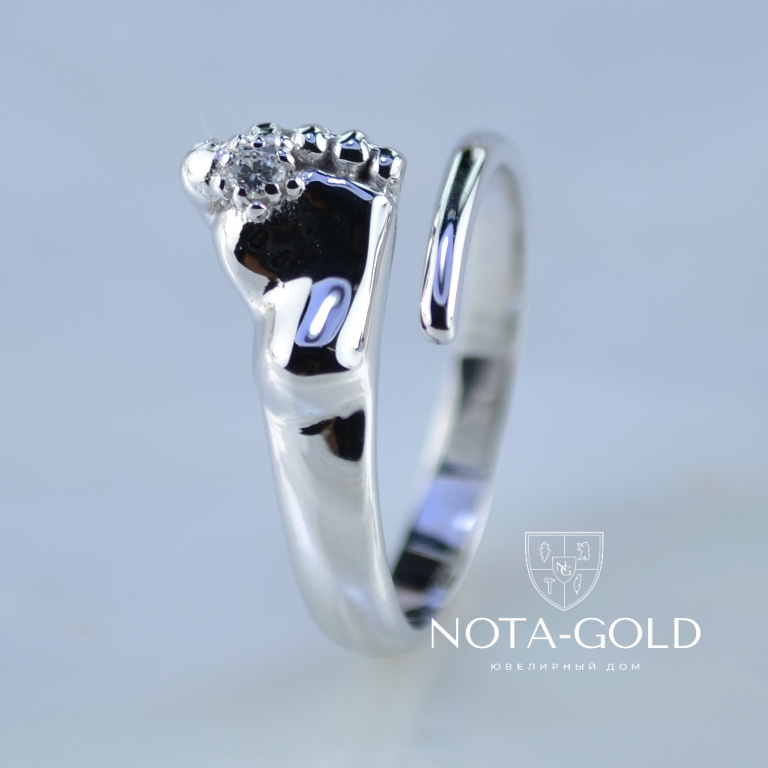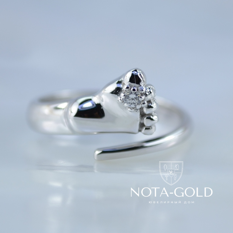 Легковесное Кольцо с пяточкой ребёнка из белого золота 585 пробы с бриллиантом (Вес: 3,5 гр.)