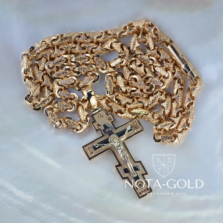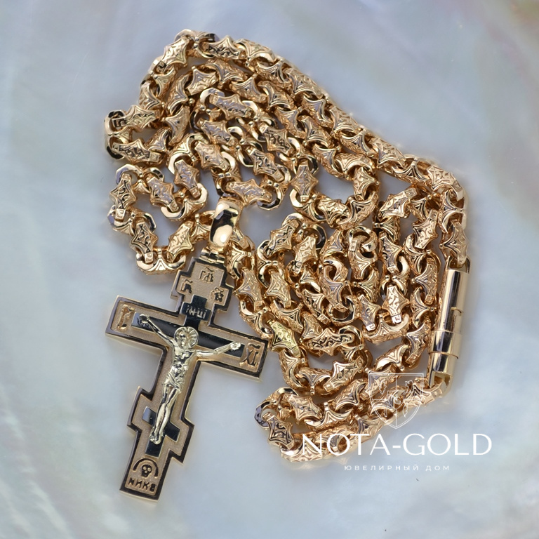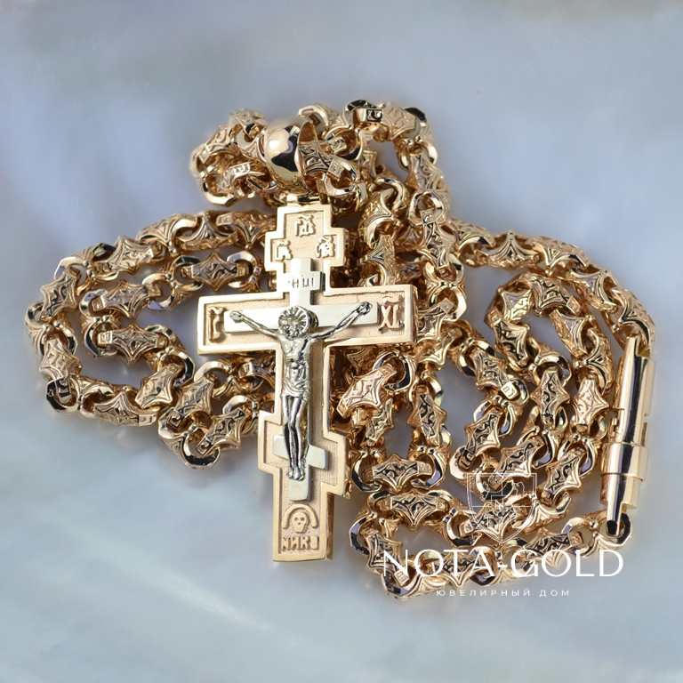 Православный мужской крестик на цепочке плетения Краб большой из красного золота (Вес: 83,5 гр.)