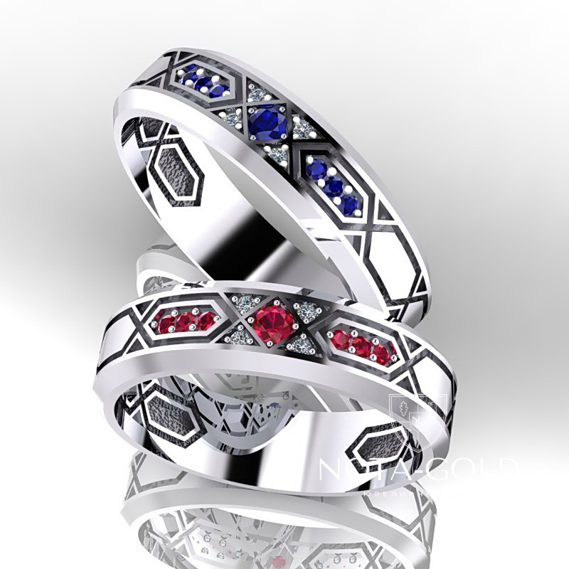 Обручальные кольца Бродвей с бриллиантами, сапфирами и рубинами из белого золота (Вес пары: 7,5 гр.)