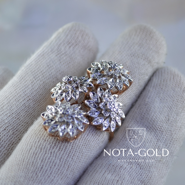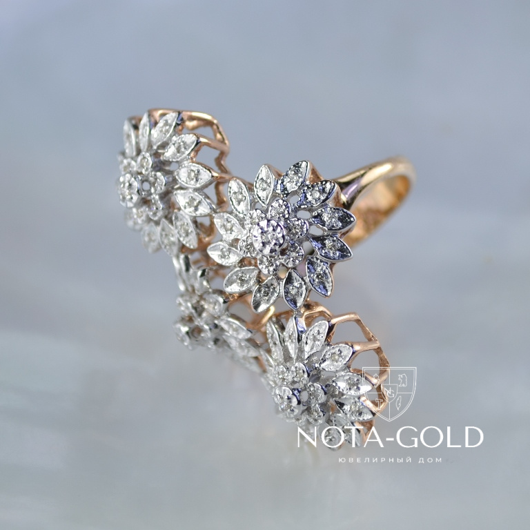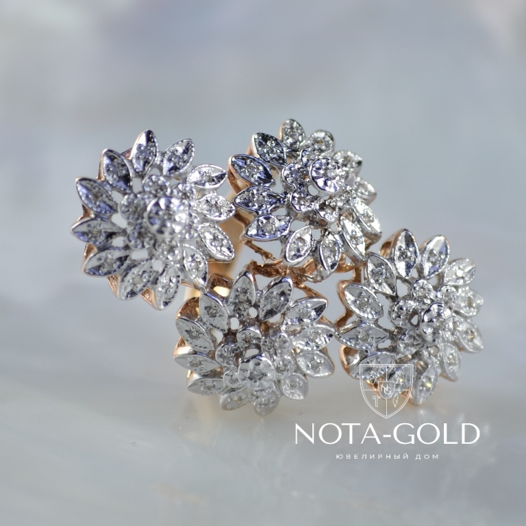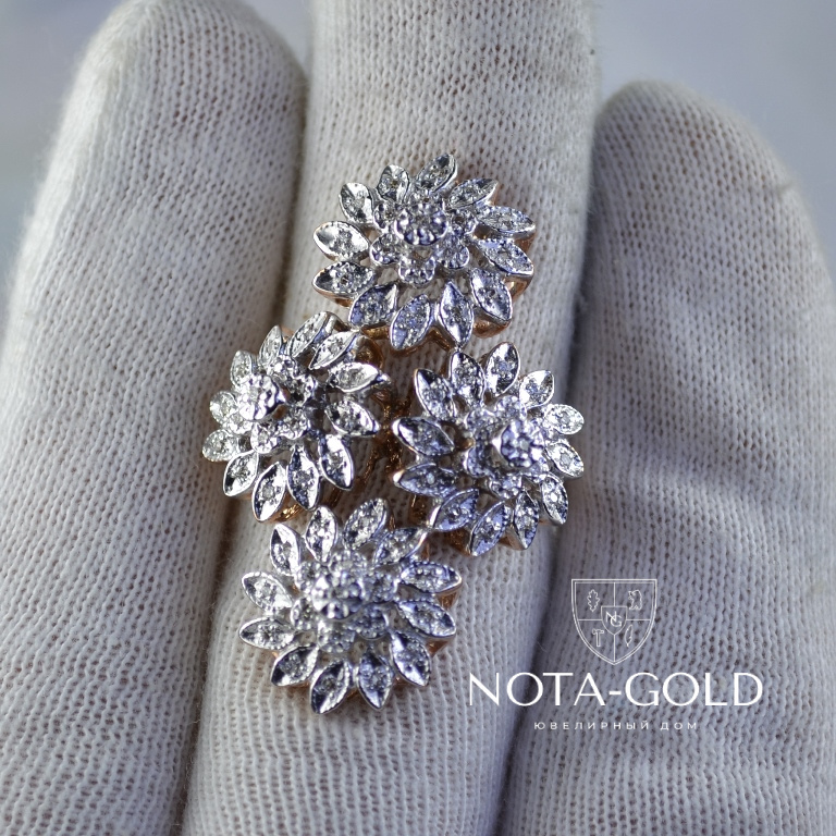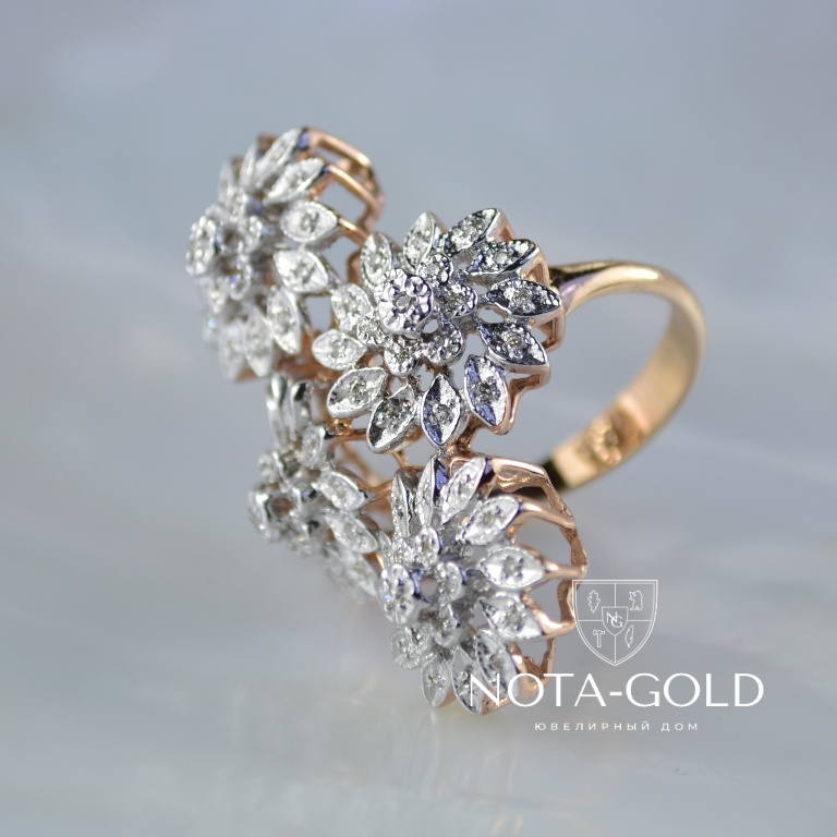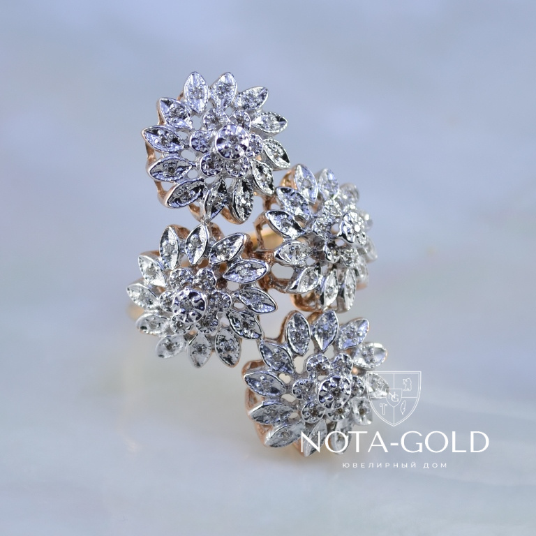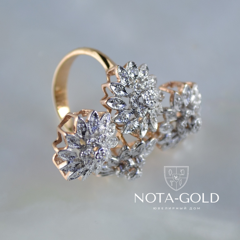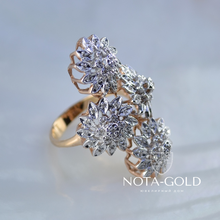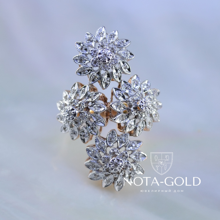 Кольцо из золота с бриллиантами в виде цветков изготовлено из серьги и подвески (Вес: 9 гр.)