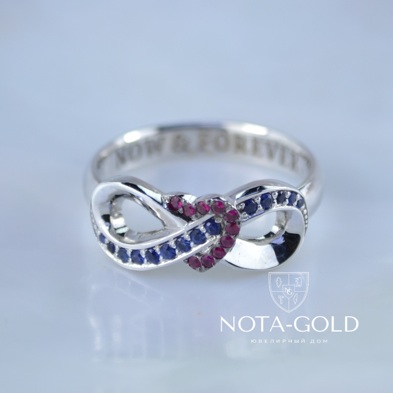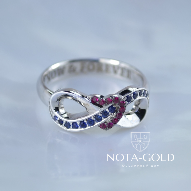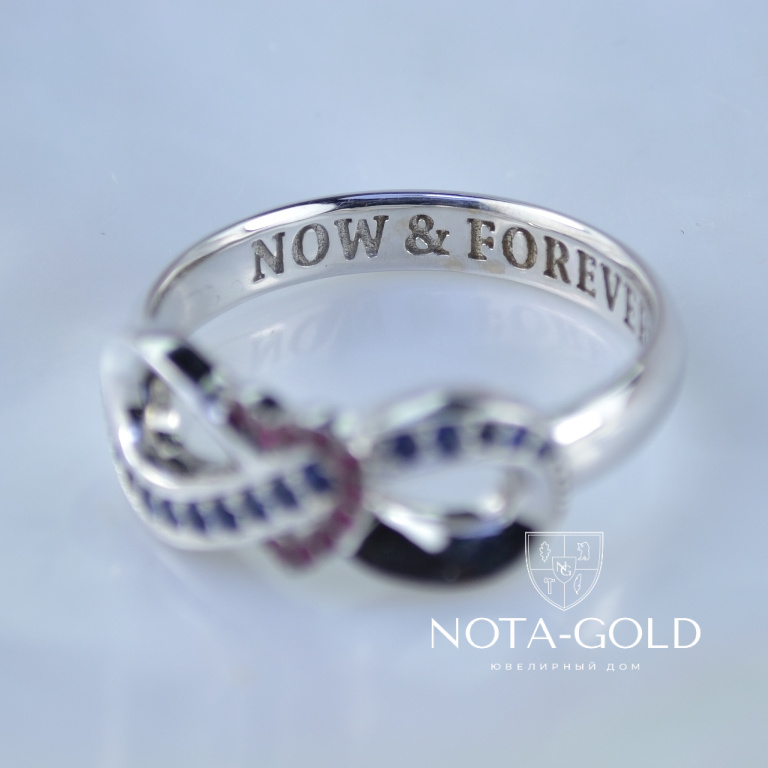 Женское кольцо с сердцем пересечённым знаком бесконечности и гравировкой now & forever (Вес: 7,5 гр.)