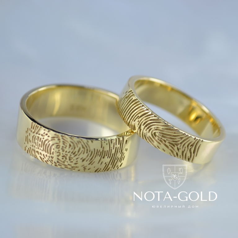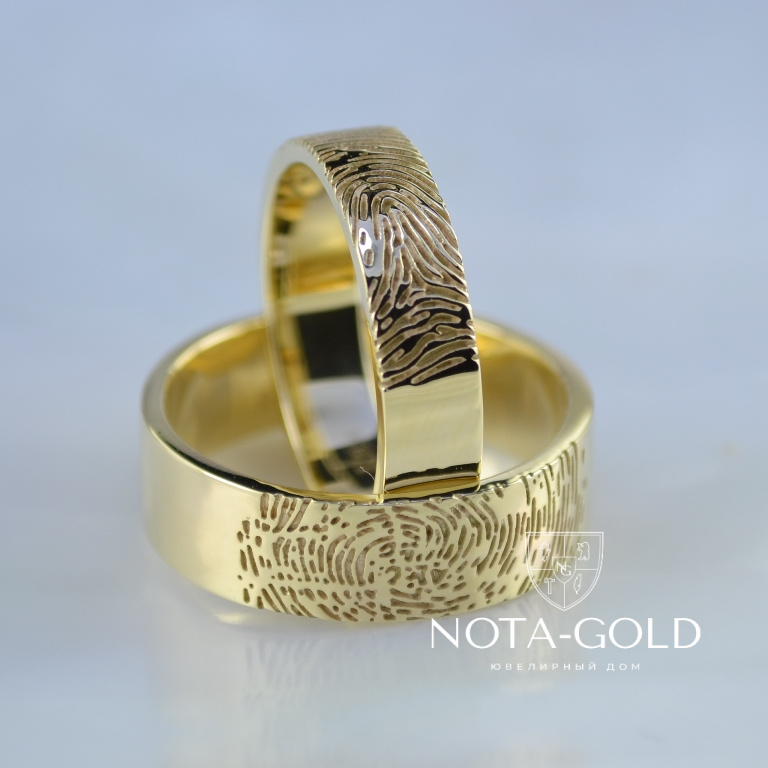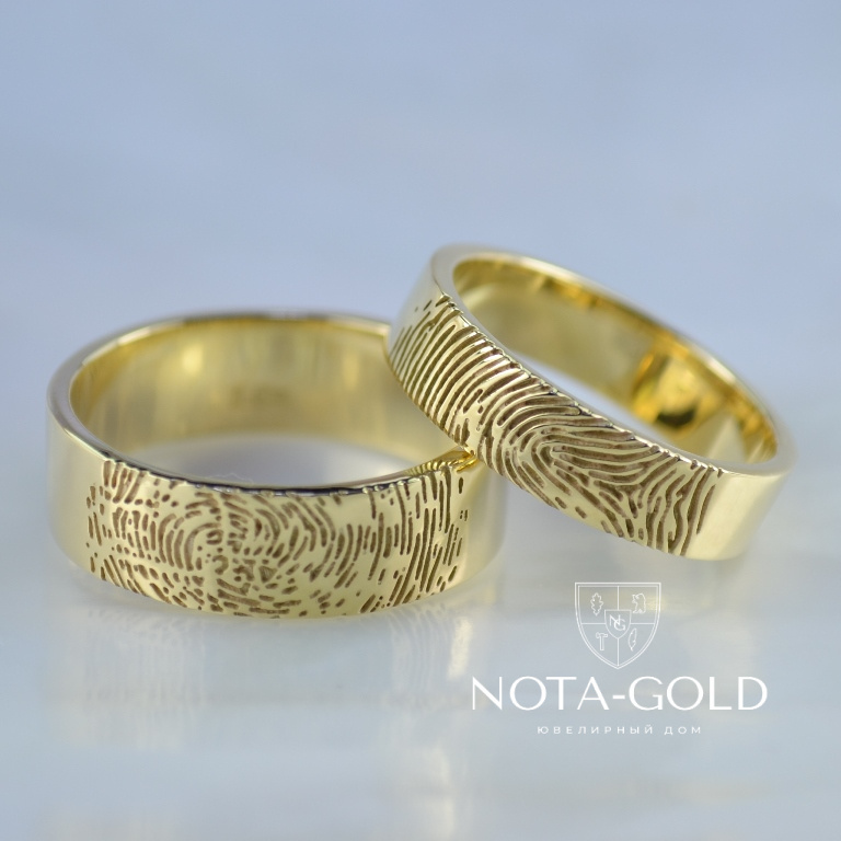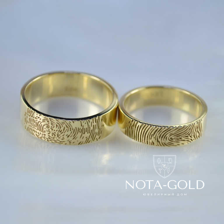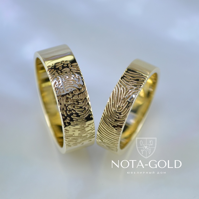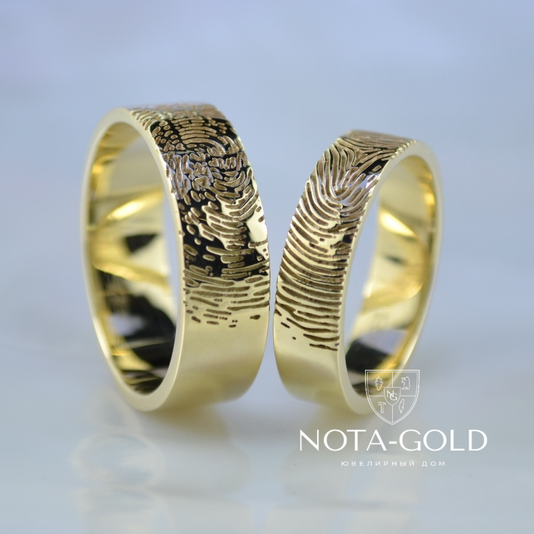 Обручальные кольца с нанесёнными отпечатками пальцев на поверхности из жёлтого золота (Вес пары: 11 гр.)