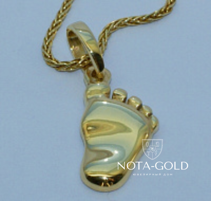 Подвеска на заказ след ноги (в виде следа ноги) ножка младенца (Вес: 2 гр.). Подвеска в виде следа от ноги изготовлена из жёлтого золота. Подвеска на заказ может быть выполнена в виде подвески на заказ след ноги из золота или подвески на заказ след ноги из серебра. След младенца, пяточка, ножка из золота. Дариться - на рождение малыша. В пятку можно закрепить маленький бриллиант.