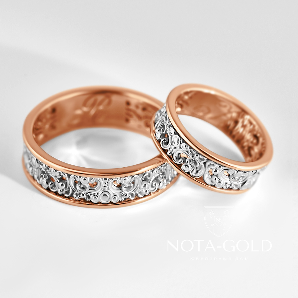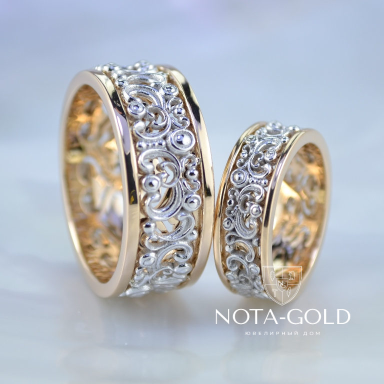 Авторские обручальные кольца с резным винтажным узором из двух оттенков золота (Вес пары:15 гр.)