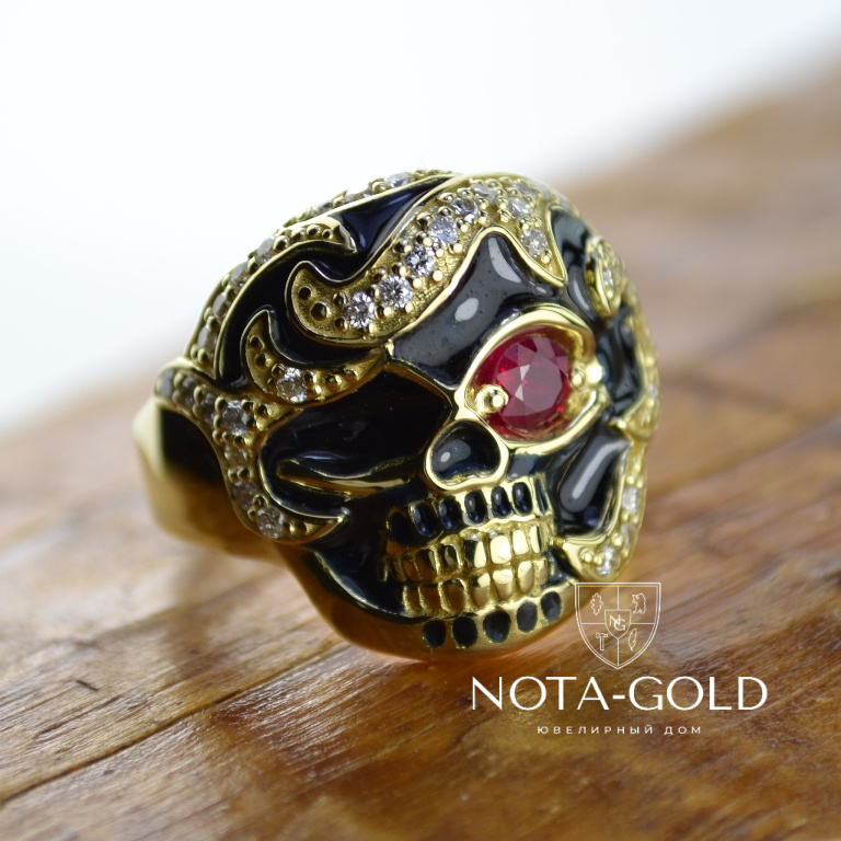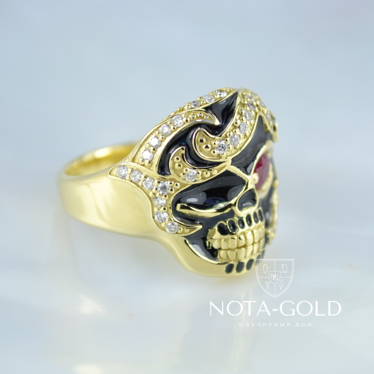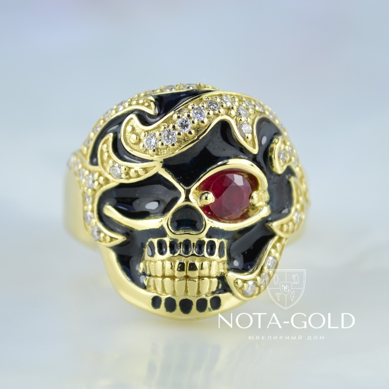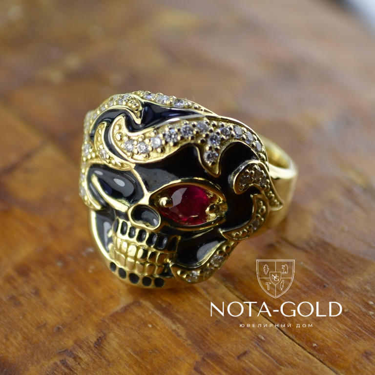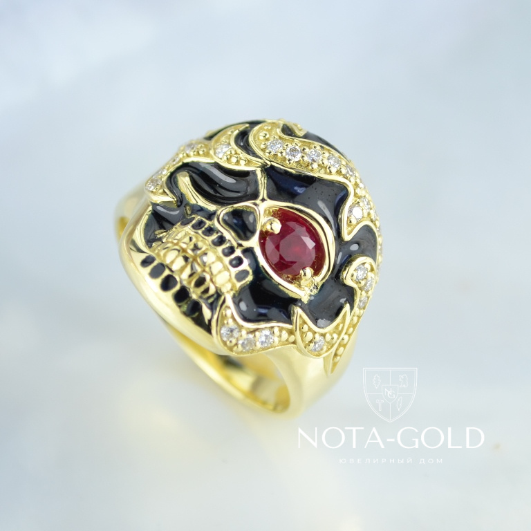 Мужское кольцо перстень череп с рубином, бриллиантами и чёрной эмалью (Вес: 17 гр.)