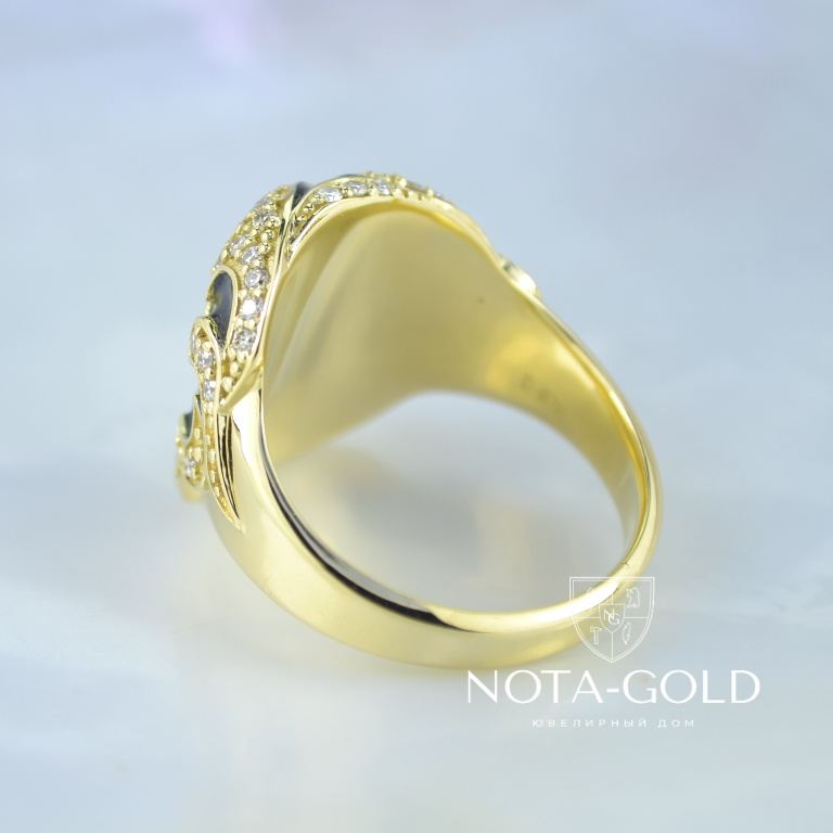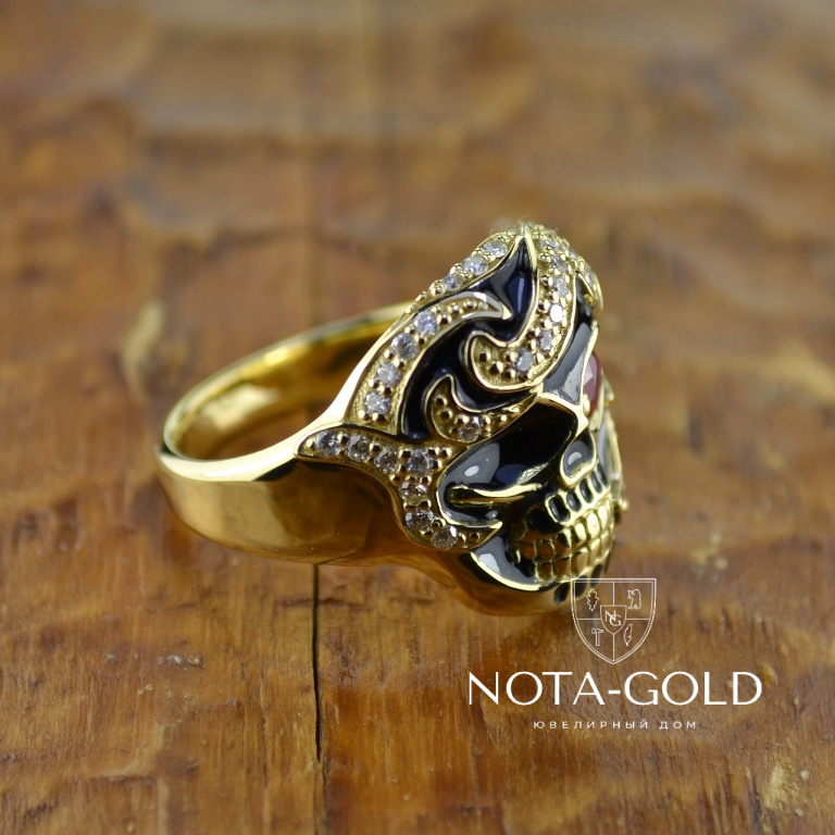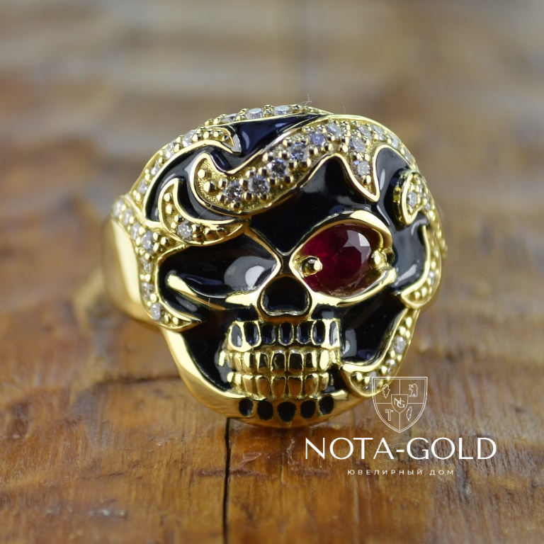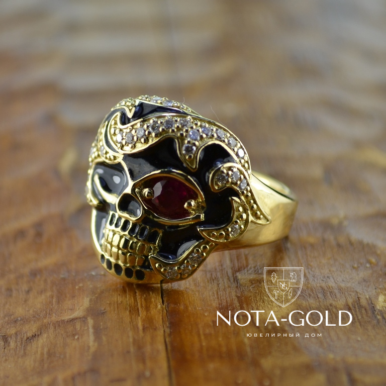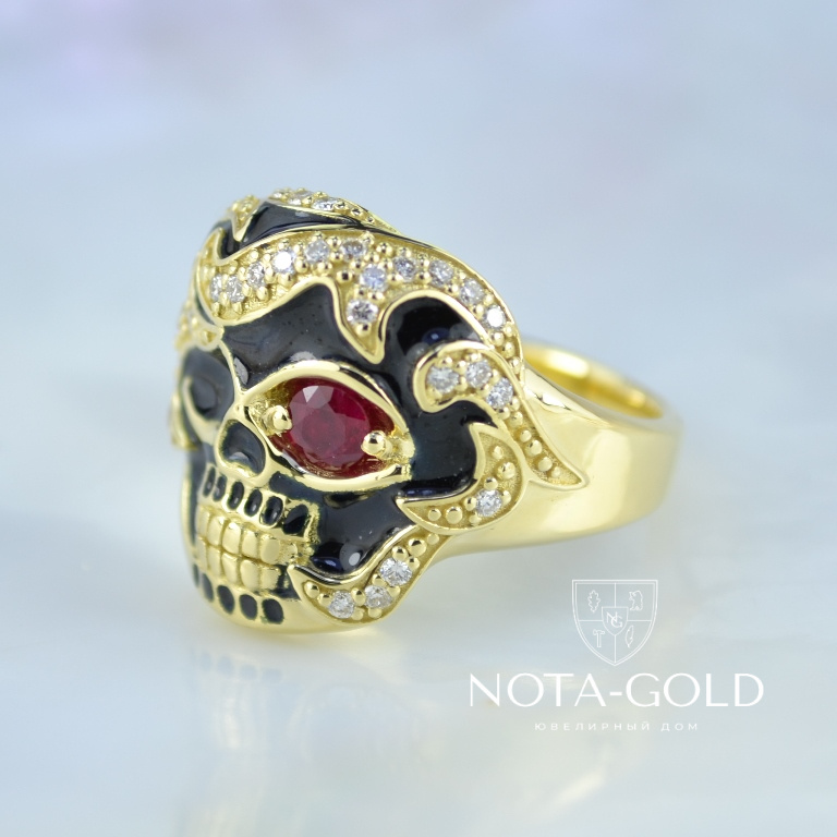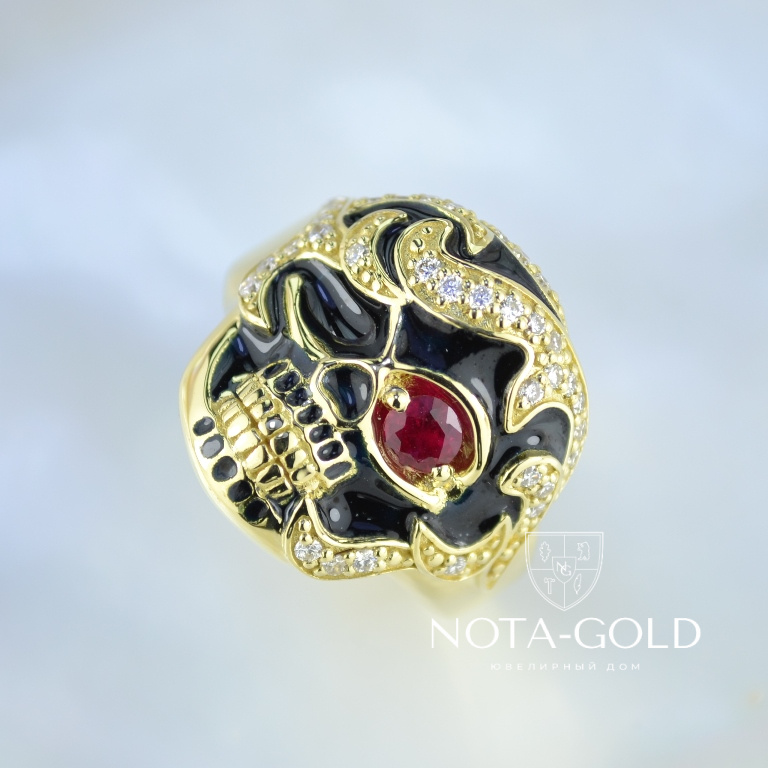 Мужское кольцо перстень череп с рубином, бриллиантами и чёрной эмалью (Вес: 17 гр.)