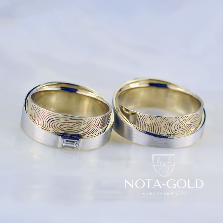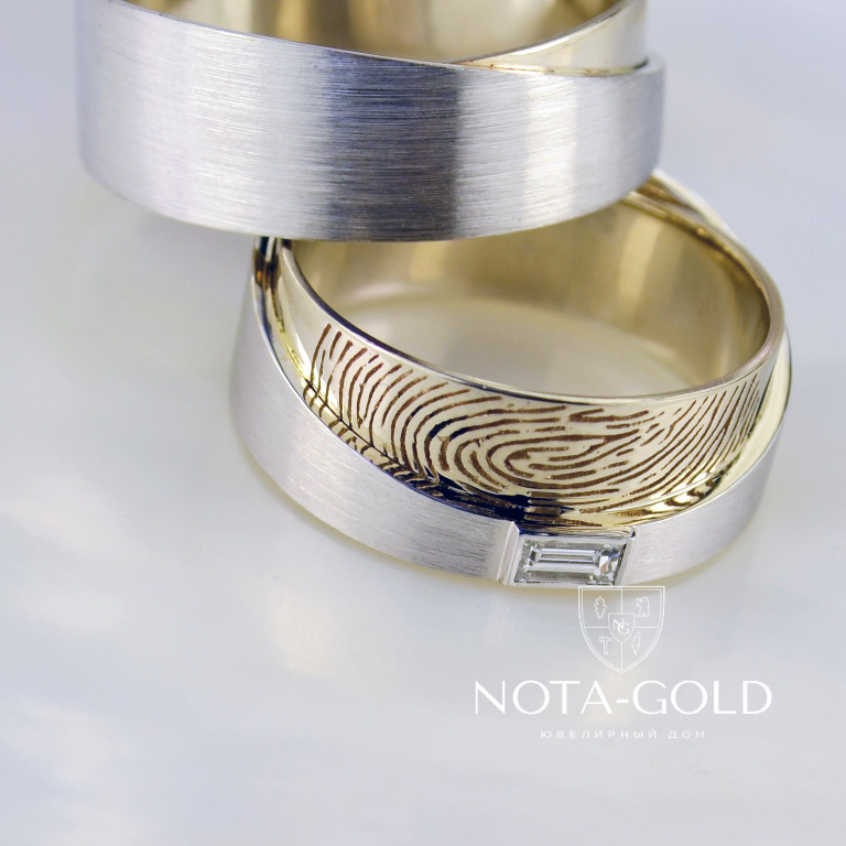 Матированное обручальное кольцо с отпечатками пальцев и бриллиантом багетной огранки (Вес пары: 16 гр.)