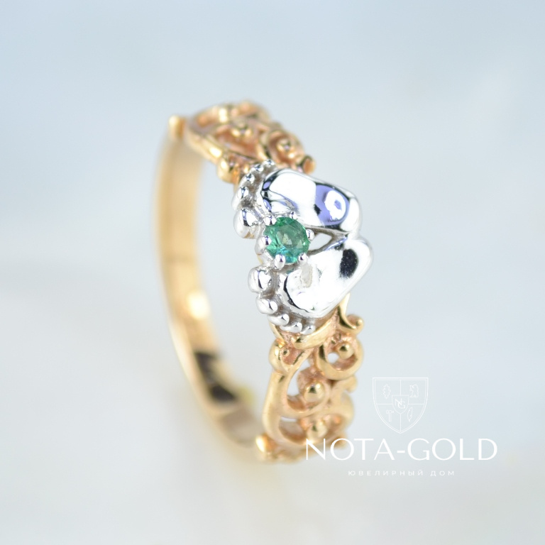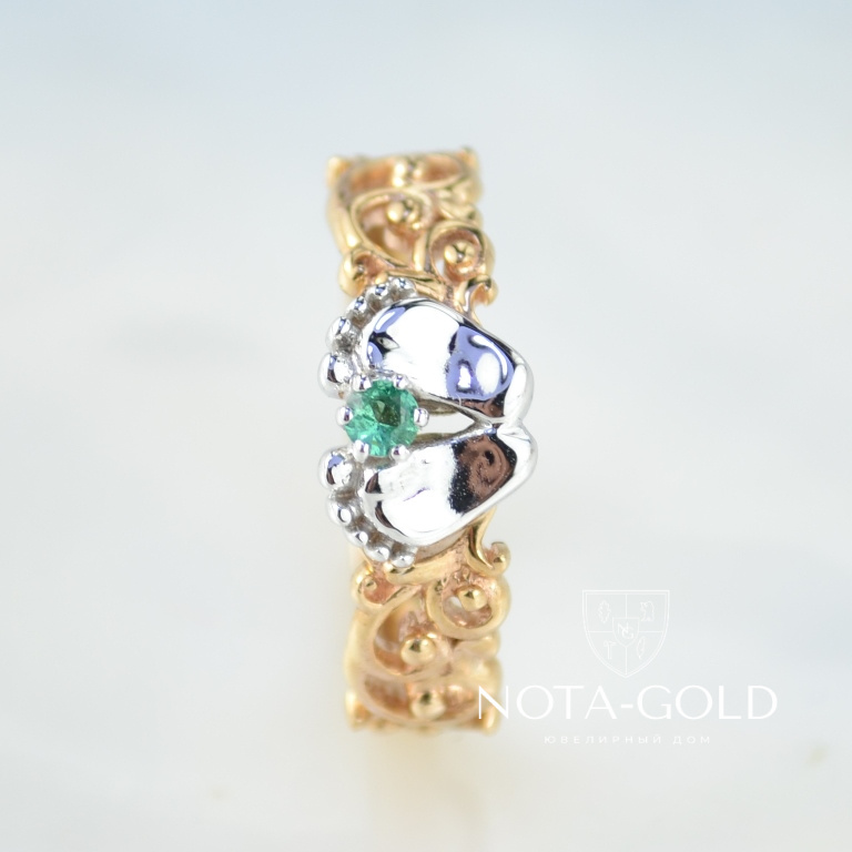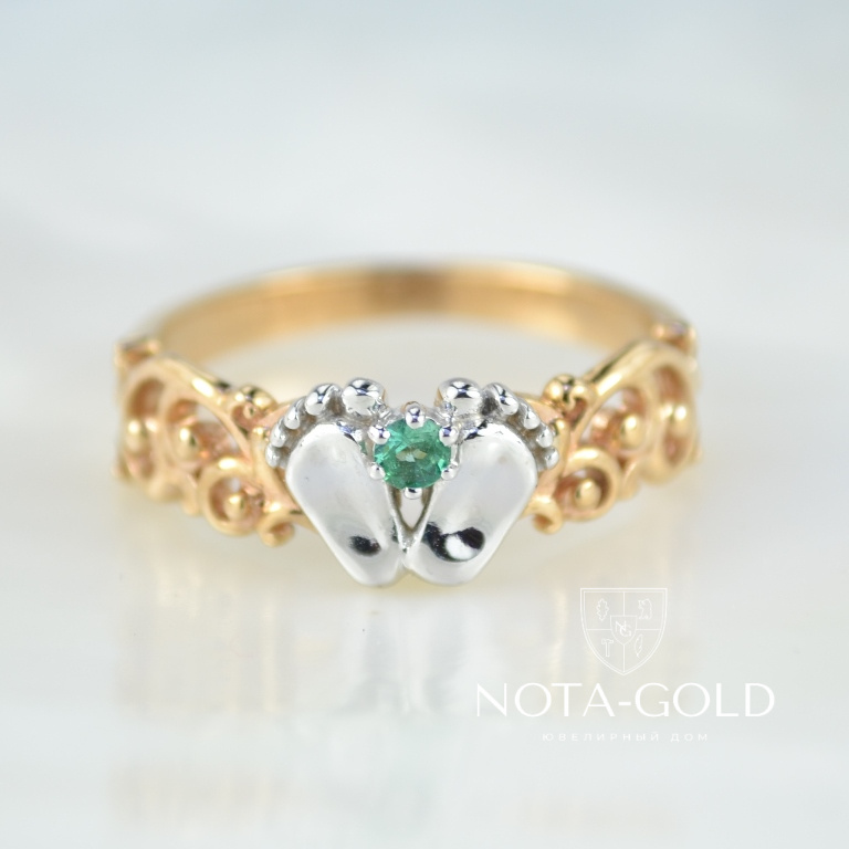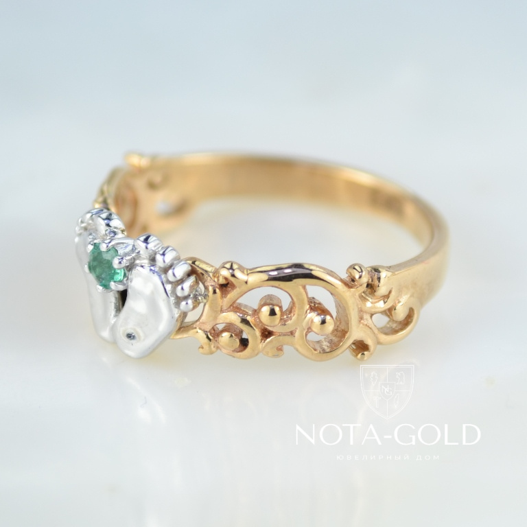Кольцо пяточки ребёнка из двухцветного золота с изумрудом (Вес: 3,2 гр.)
