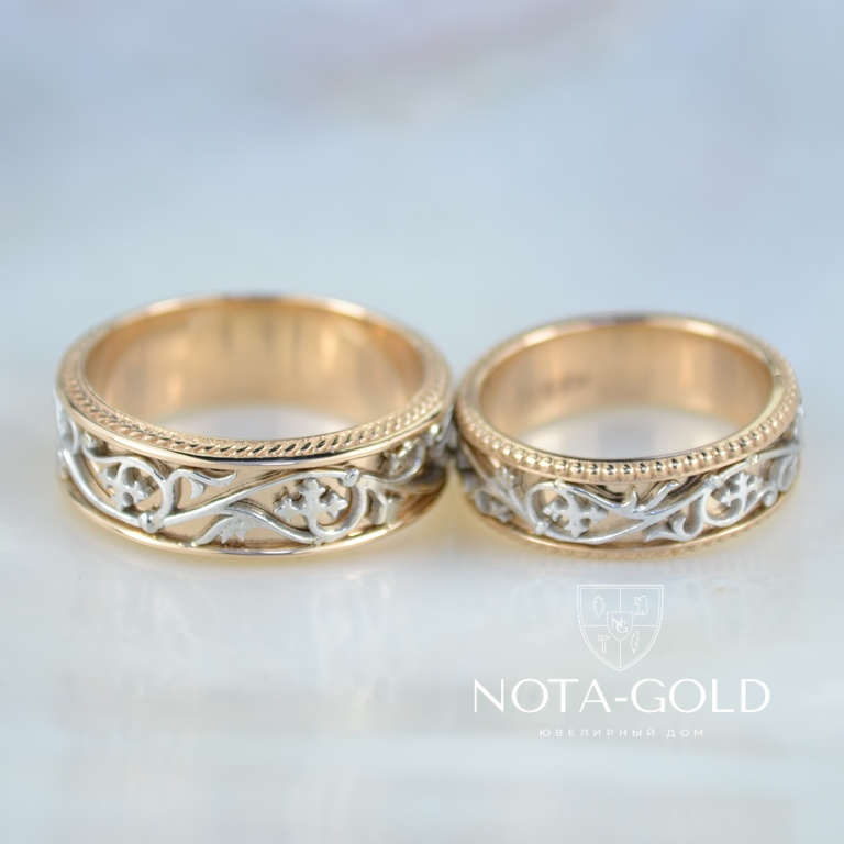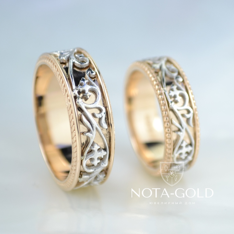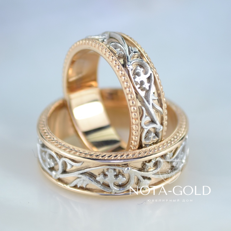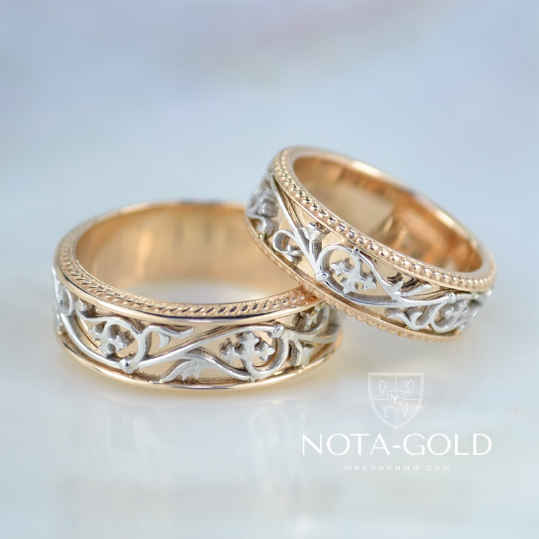 Двухцветное обручальное кольцо с резным узором из золота (Вес 15 гр.)