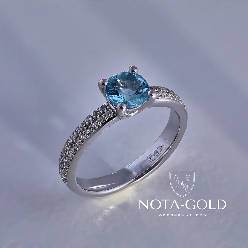 Кольцо из белого золота с аквамарином и россыпью мелких бриллиантов (Вес: 3 гр.)